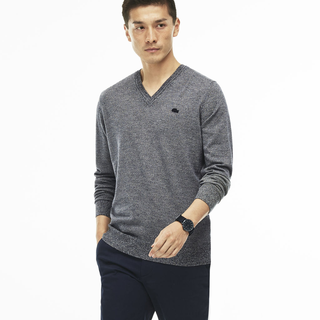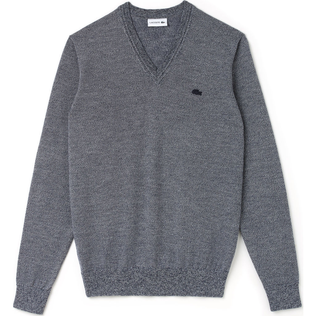 Crafted in rich wool, Lacoste's V Neck Jersey Sweater boasts elegance and class with its refined appearance, lustrous feel and unparalleled warmth. Easy to coordinate with and timelessly charming, this grey wool sweater can add some sophistication to any wardrobe.