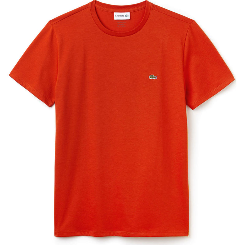 Exuding comfort and minimalist elegance, the Orange Men's Pima Jersey Shirt from Lacoste is a staple of any complete wardrobe. Crafted from 100% cotton, this light weight tee is a go-to look whether you're lounging around the house or headed out for a casual night with friends. This crewneck t-shirt features a regular fit that is suitable for most body types.