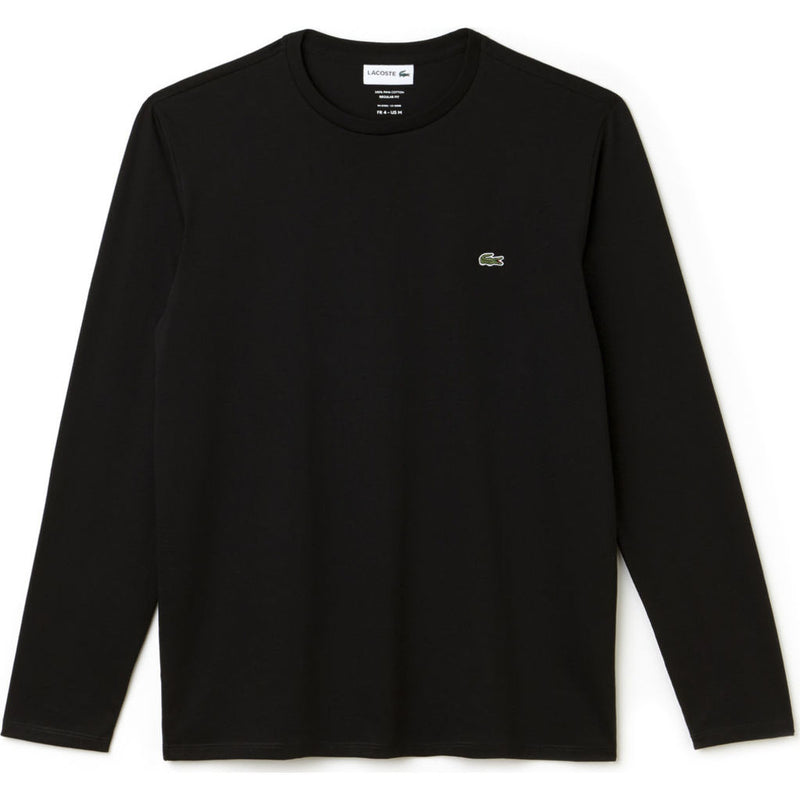 Exuding comfort and minimalist elegance, the Black Men's Long Sleeve Pima Jersey Shirt from Lacoste is a staple of any complete wardrobe. Crafted from 100% cotton, this light weight long sleeve is a go-to look whether you're lounging around the house or headed out for a casual night with friends. This crewneck shirt features a regular fit that is suitable for most body types.