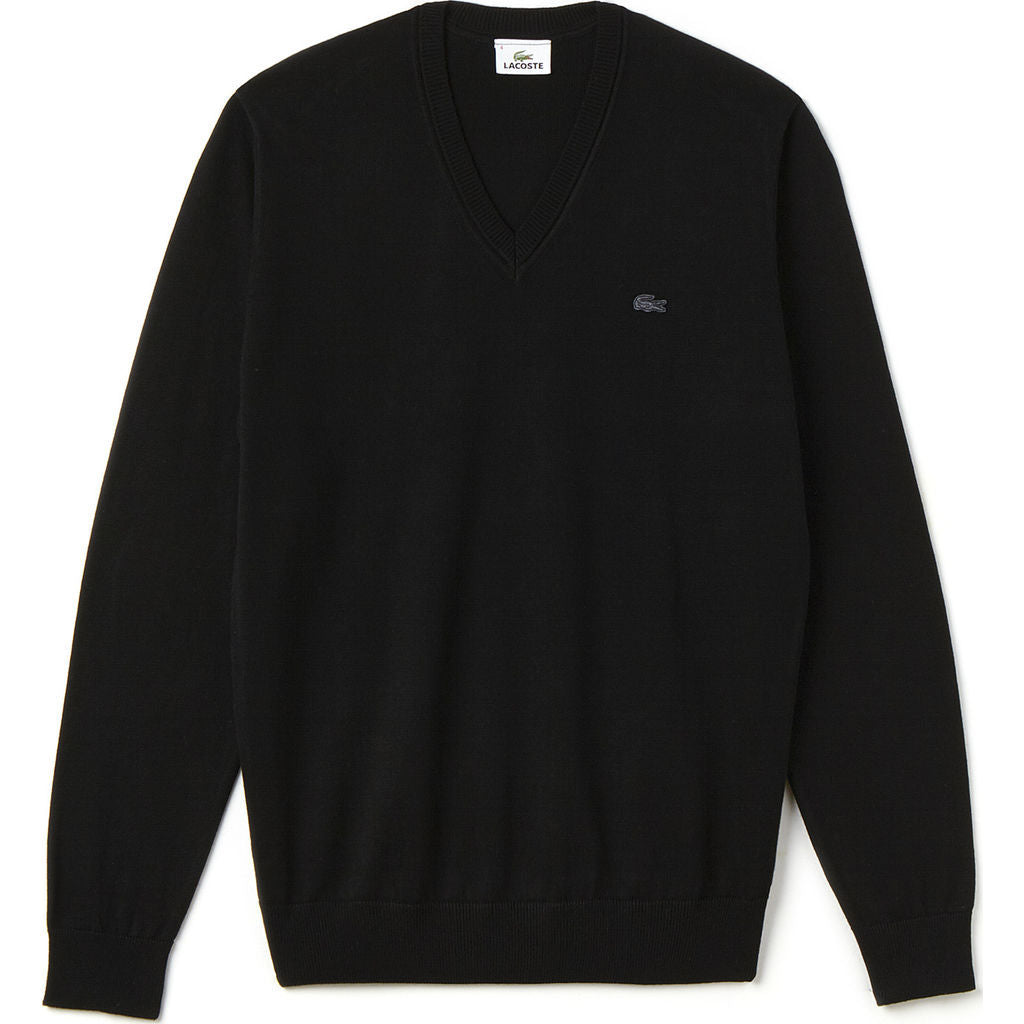 The Men's Ribbed V-Neck Sweater from Lacoste is boasts timeless elegance and lightweight cotton construction. Subtle refinement like textured pique on the elbows and a tone on tone croc applique only add to this black sweaters sophisticated aesthetic.