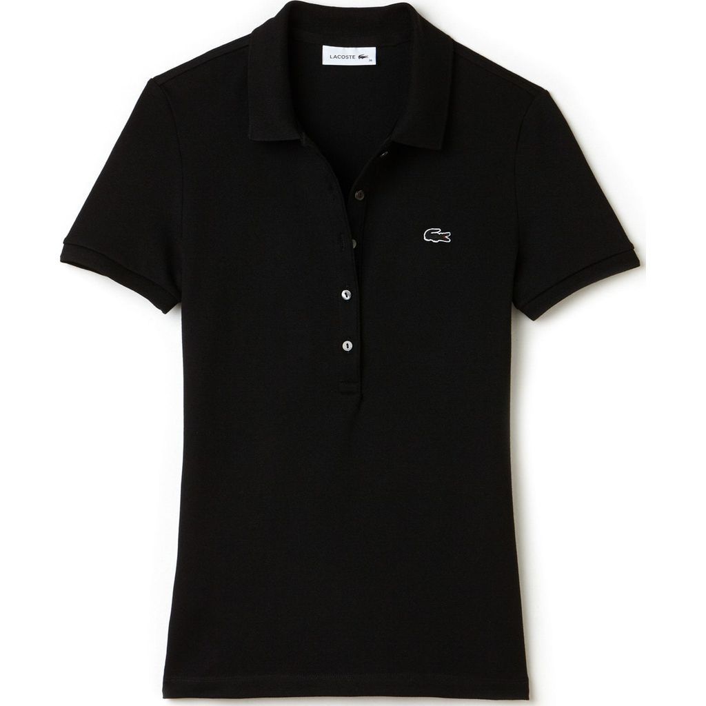 The Black Lacoste Slim Fit Stretch Cotton Pique Women's Polo Shirt is comfy and stylish. Featuring a slim fit that is sure to flatter, this shirt will become your new favorite. Signature feminine flair with refined mother-of-pearl buttons to create a truly classic shirt.