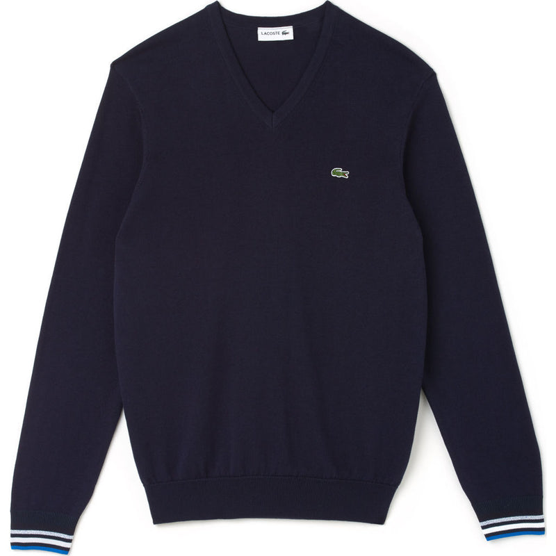 Lacoste reimagines their own timeless minimalism with a refreshing, contemporary twist to bring you the Men's Stripe Accented Seater. Crafted for ultra-soft cotton, this v-neck sweater's vibrantly colored wristbands beautifully compliment the navy blue cotton and slim, flattering fit.