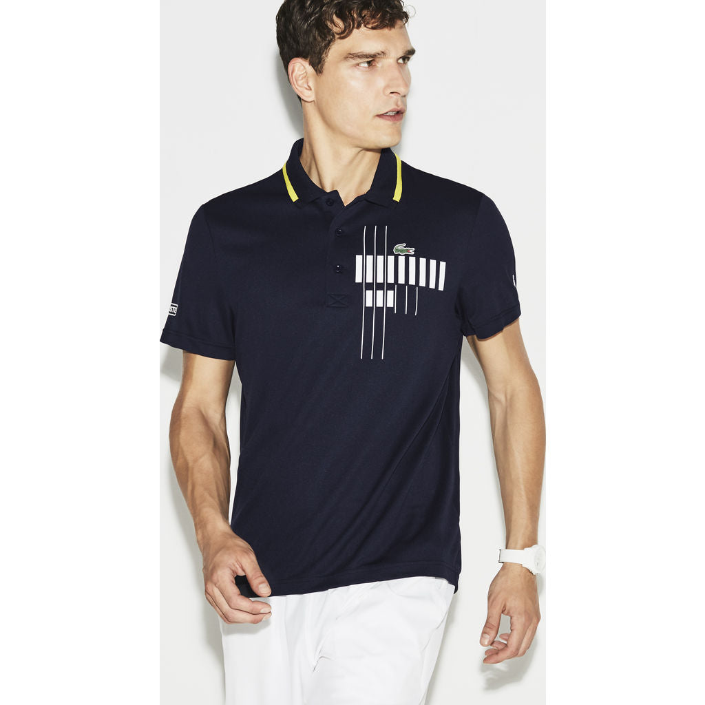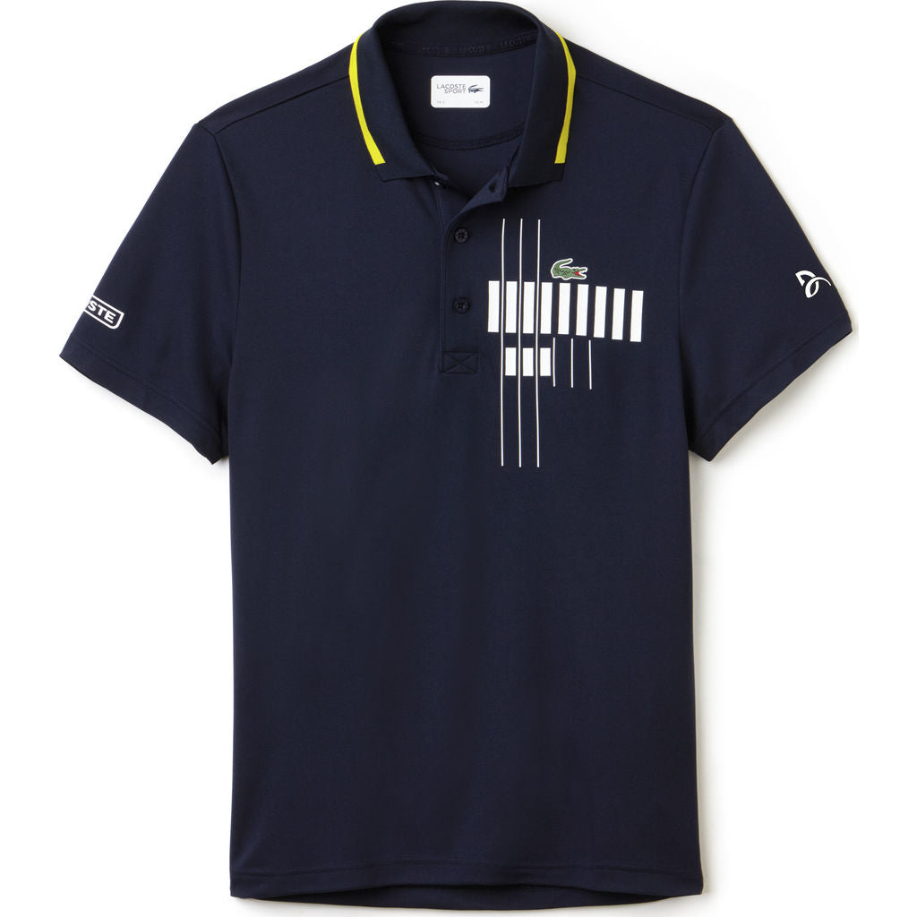 Just one piece of their new collaboration collection with icon Novak Djokovic, this polo shirt has been crafted entirely out of Lacoste's unique ultra-dry polyester material. Perfect for a variety of sports and athletic activities, the Navy Blue Novak Djokovic Men's Polo Shirt is sure to keep you dry and comfortable without sacrificing any freedom of movement. Boasting an eye-catching contemporary aesthetic, this polo is outfitted with a striking modern graphic on the chest in addition to a three-button unicolor collar.