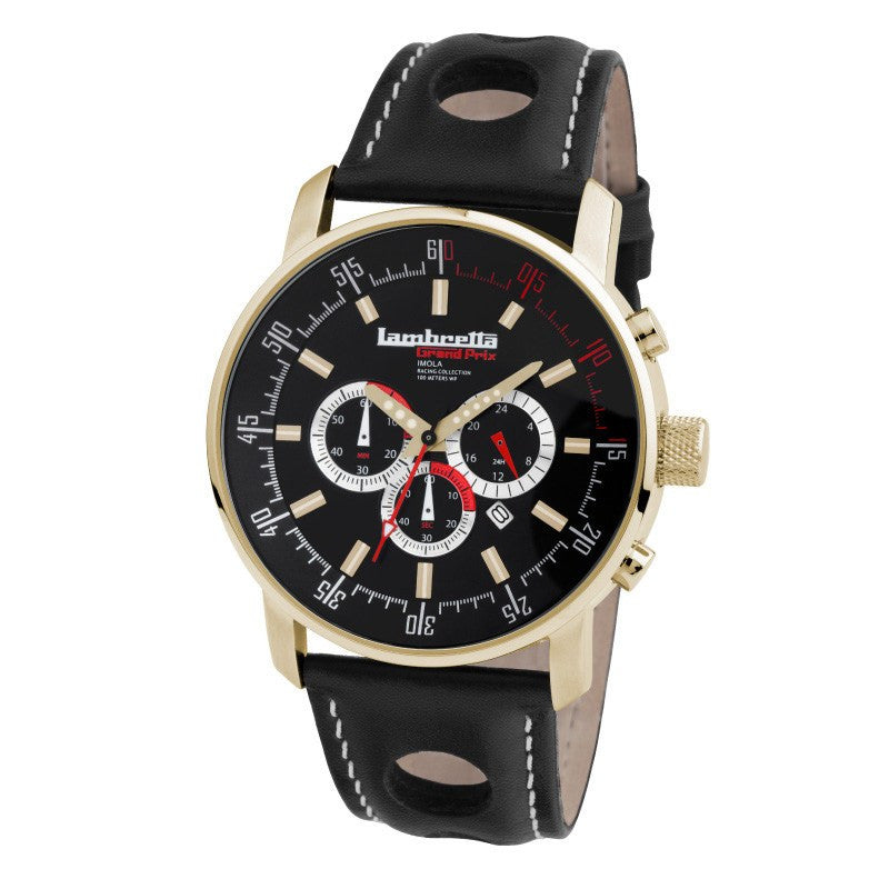 Inspired by 60's racing, this classic Imola Chronograph from Lambretta is dedicated to the international Autodromo Enzo e Dino Ferrari, located in the town of Imola in Italy. Coupled with a racing style leather strap, the Imola marries retro style with modern class to create a timeless classic. Gold plated for the true gentleman among racers.
