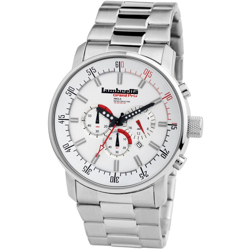 The Lambretta Imola Watch is a 60's racing inspired chronograph that's dedicated to those who desire to go faster and the heritage of the International Autodromo Enzo e Dino Ferrari in the town of Imola, Italy. The elegant design and steel bracelet makes this timepiece the perfect accessory for the modern man.
