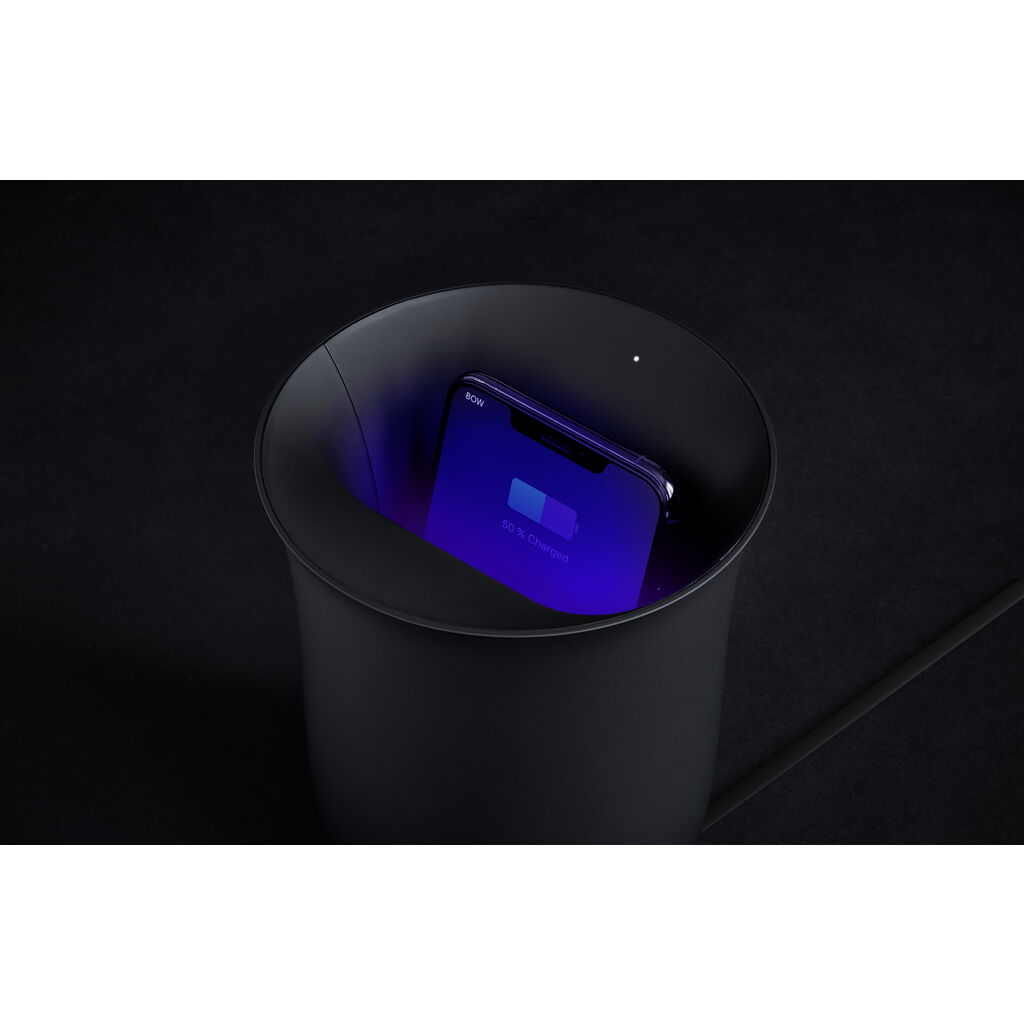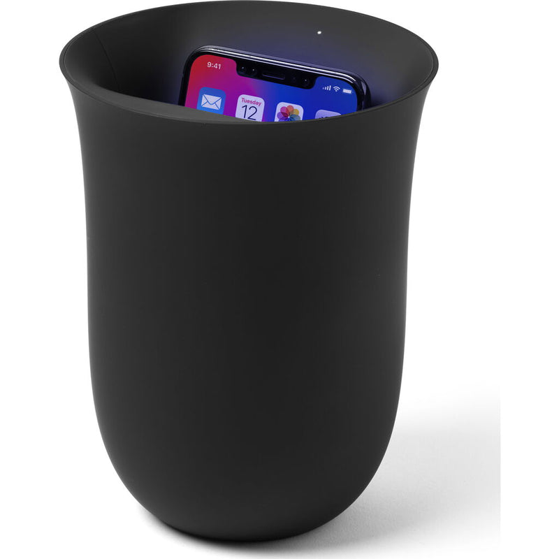 Oblio, a beautiful place to sanitize and charge your smartphone. A wireless charging station designed with a vase shape that discreetly kills harmful viruses and bacteria that inevitably make their way onto your mobile device. Oblio is engineered with ultraviolet light technology (UV-C LED) in its front interior that works as a sanitizer and disinfectant for smartphones. UV-C LEDs destroy and eradicate the DNA of microorganisms found in viruses, bacteria, mold, and germs. Oblio is designed to sanitize a single surface at a time. For a 360° disinfection, simply flip your phone to expose its second surface for the 20 minute sanitizing cycle. Limiting our exposure to viruses and bacteria is something we can all appreciate the importance of today. This is why Oblio has been proven through lab testing to kill 99.9% of viruses, including H1N1. It can be difficult to disconnect from our phones, Oblio is a thoughtfully designed place to put your phone for safekeeping while it disinfects and charges. Providing an opportunity for you to be more present and take a break from your screen.