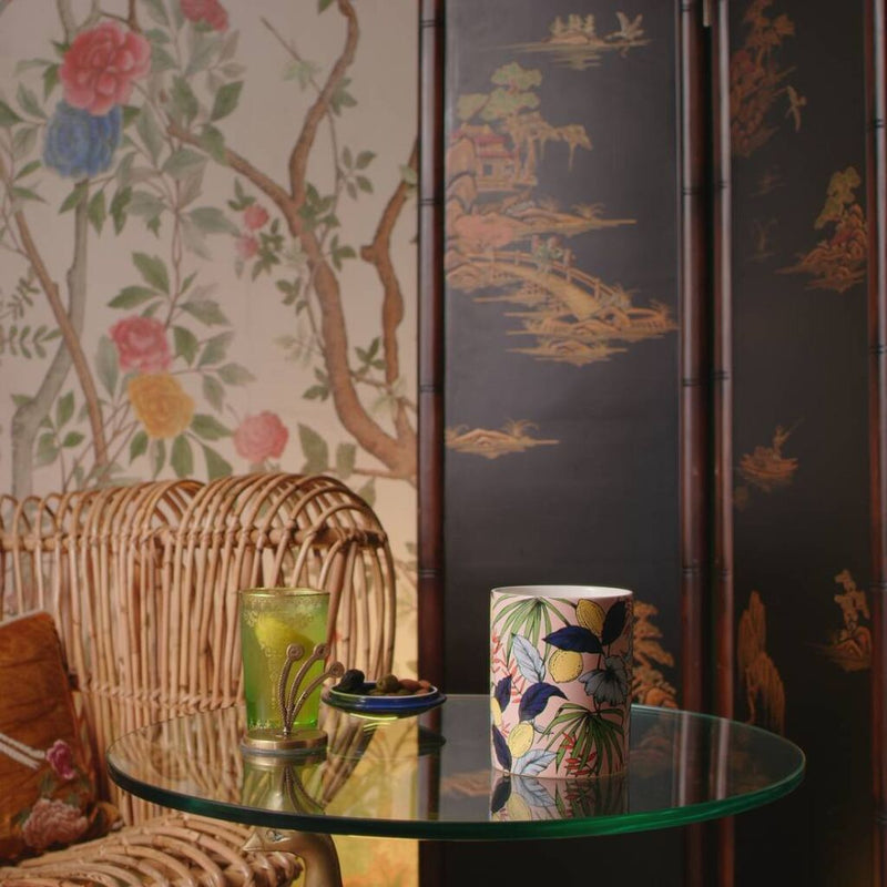 An exotic scented candle with key notes of citrus, clove and green tea. Infused with essential oils and featuring notes of bergamot, ginger dusted citrus, green tea, touches of apple, juniper and clove above peppered jasmine and tobacco. Housed in a beautifully designed ceramic candle holder featuring bright lemon and multicolored palm tree patterns. The Mansour Marrakech candle comes in a beautifully packaged gift box and will energize and excite your senses. Our candles are sustainably sourced, free from pthalates and parabens and made with a 100% organic cotton wick.