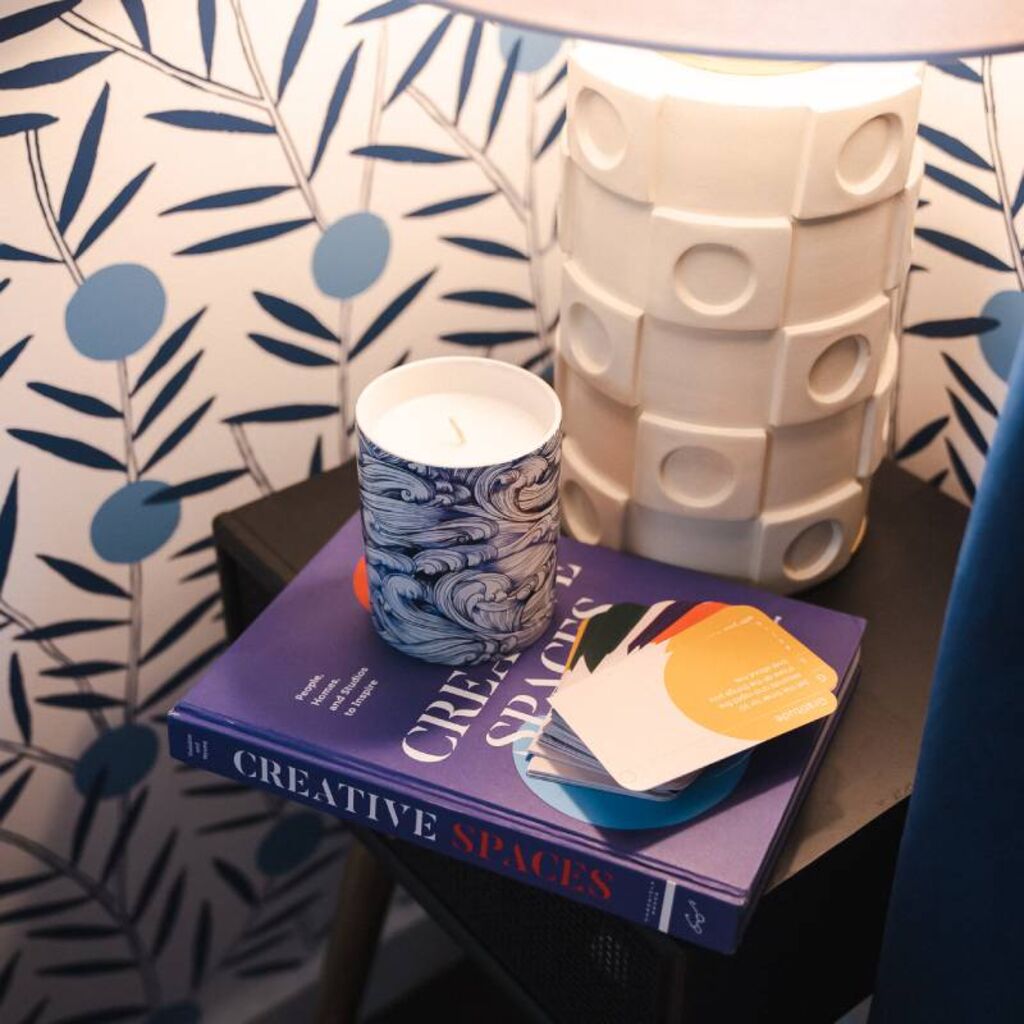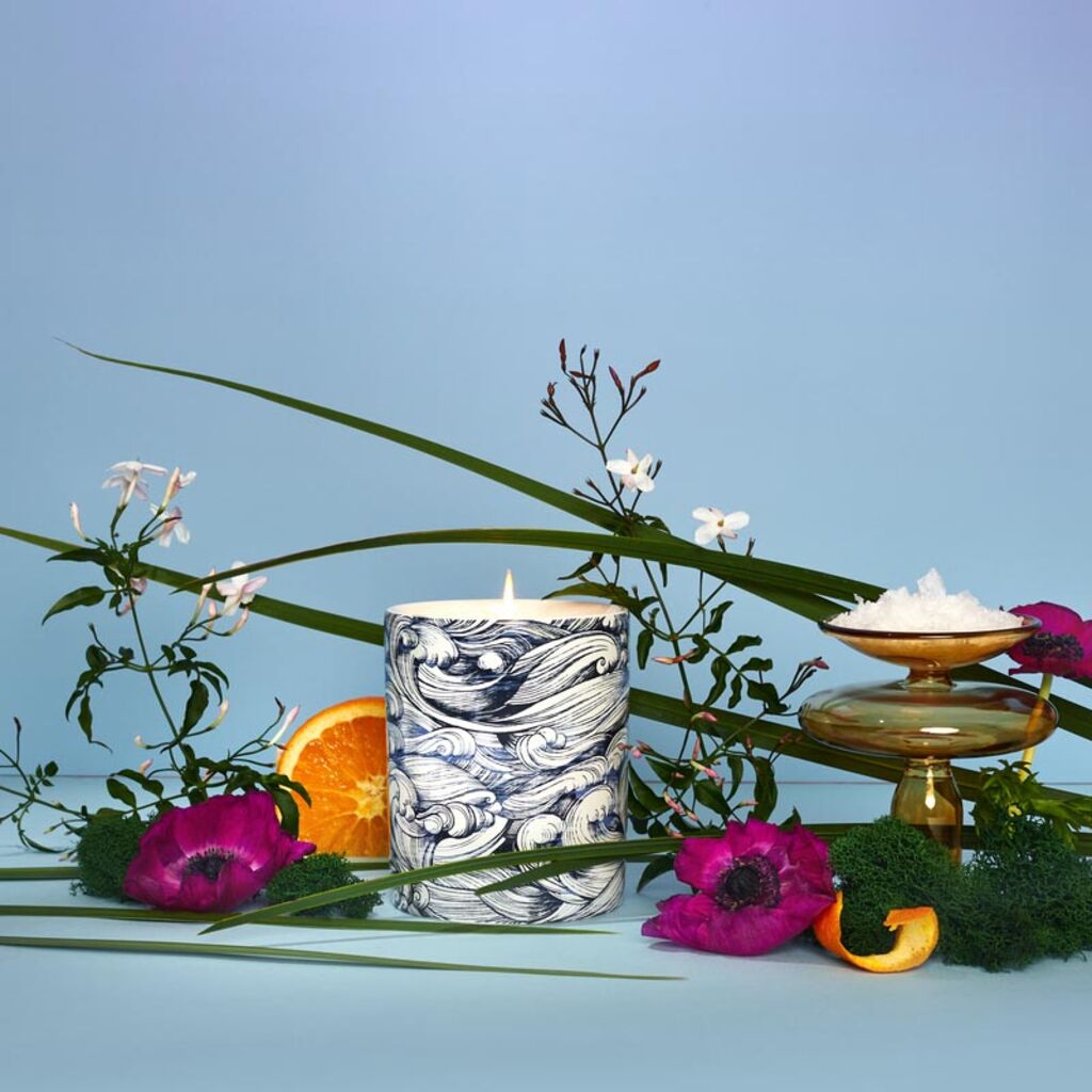 A soothing scented candle with key notes of sea salt and vetiver. Infused with essential oils and featuring notes of sea salt, violets, and vetiver, the Whitby candle is soothing, uplifting and full of joy. Housed in a beautifully designed ceramic candle holder featuring blue and white crashing waves. The Whitby candle comes in a beautifully packaged gift box. Our candles are sustainably sourced, free from pthalates and parabens and made with 100% organic cotton wick.
