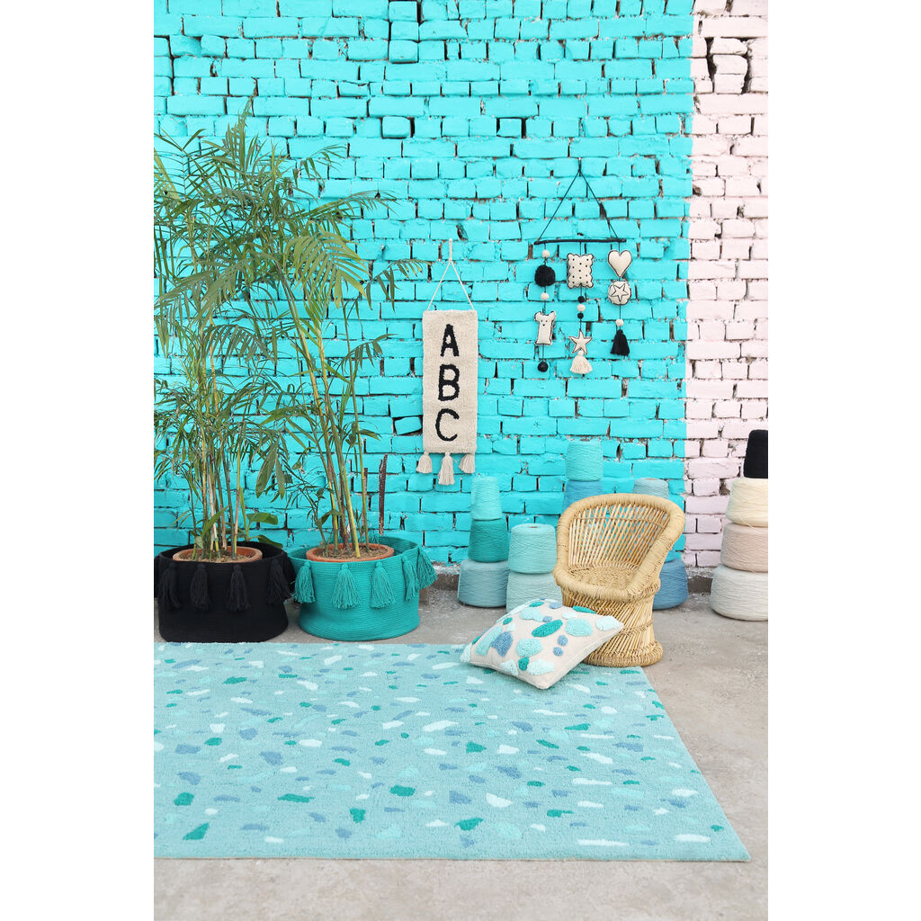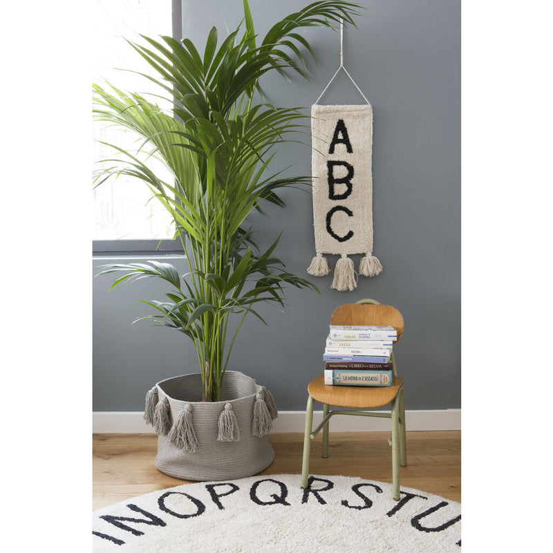 The ABC wall hanging reflects the new trend in wall decoration and is ideal for adorning the walls of living rooms, corridors, entrance halls, children's rooms, bedrooms, etc. The main color is that of undyed natural cotton and black (natural dye), providing a natural elegance that blends into any style, contemporary or classic. Wall hanging made from 100% natural cotton, created with the same technique as our rugs and finished off with three pom poms. It is hung with a cord joined to a plastic pole concealed in the upper part of the hanging. It combines perfectly with the Round ABC rug, Circle, Black or Arrow cushions and the Natural Black basket and blanket.
