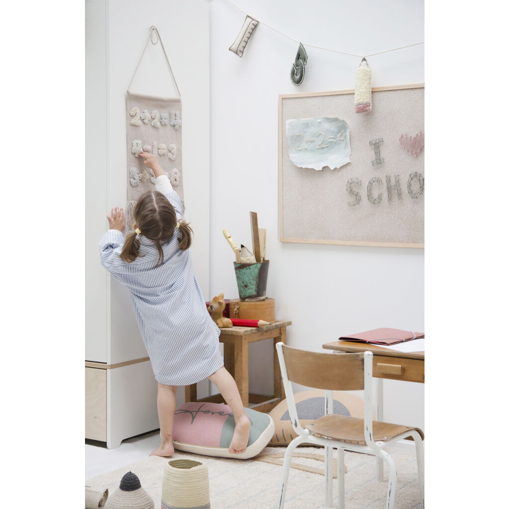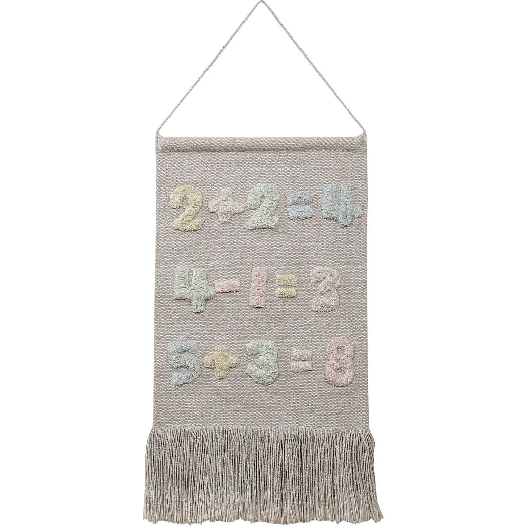 The wall hanging Baby Numbers brings to light a new shade of gray prepared especially for this collection. These designs will help children become familiar with numbers from very young. The numbers have been woven with a mixture of pastel colors to simulate the writing effect on the board. With fringes on the sides also made by hand.