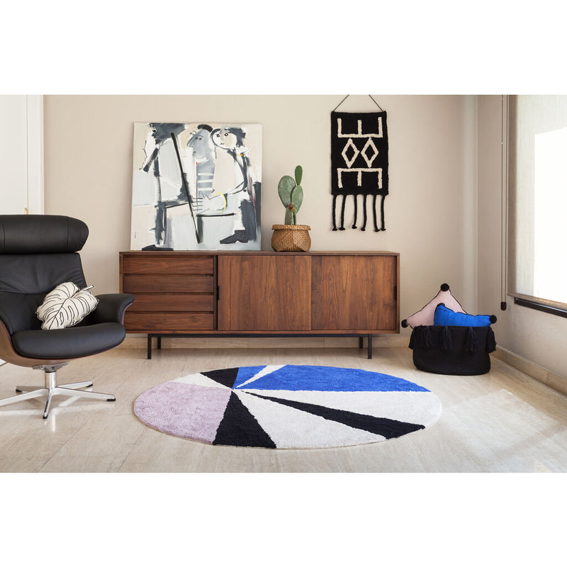 The geometric patterns have established themselves as one of the great trends among interior designers, they lend elegance, are versatile, sophisticated and visually attractive. The round Geometric rug is washable in a domestic washing machine and 100% cotton with natural dyes. The colors have a special importance because they determine the shapes and are used to establish continuity and elegant contrasts. This rug suits a children's setting, whether a girl's or boy's bedroom or playroom, but also living rooms, bedrooms, patios and gardens. Hand-made by craftspeople, its natural dyes make it safe to use and it is light, soft and pliable. Combine it with Square cushions and the Geometric wall hanging.