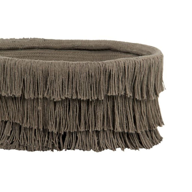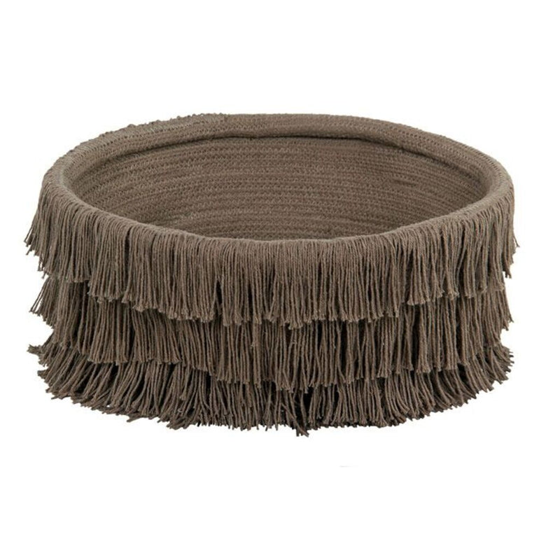 A bird's nest in the house! Basket decorated with tousled fringes of different lengths and handmade with brown cotton string. A fun place to keep toys or a bold decorative object with a bohemian vibe. Our baskets can be easily cleaned at home with a damp cloth. They are handmade one by one by artisans who take care of every detail and with 100% natural fibres and non-toxic dyes.