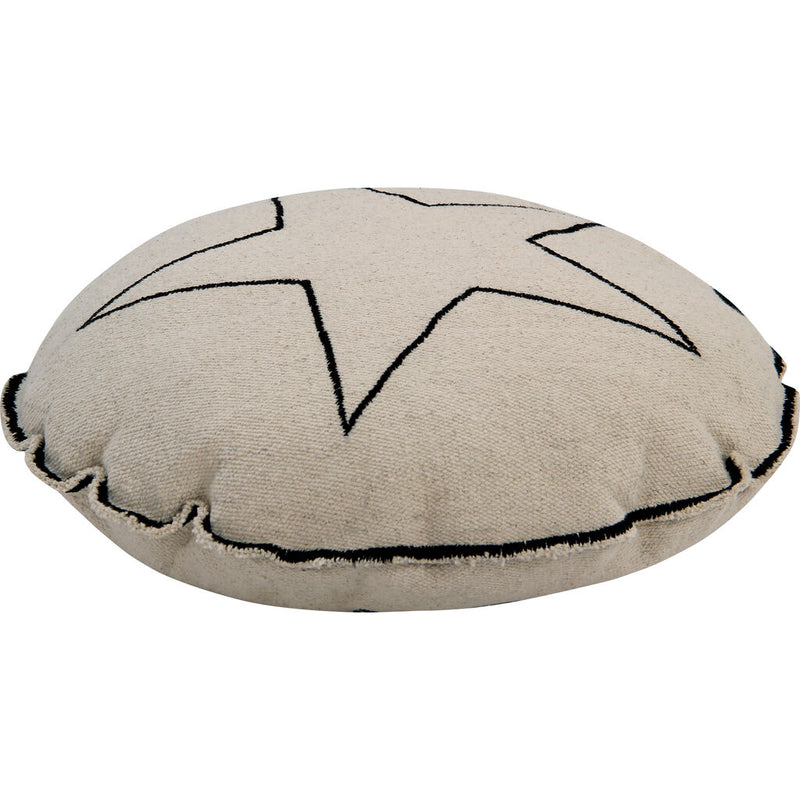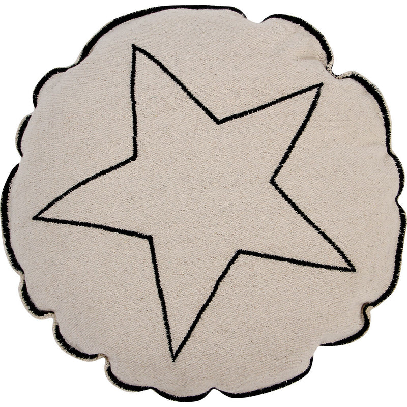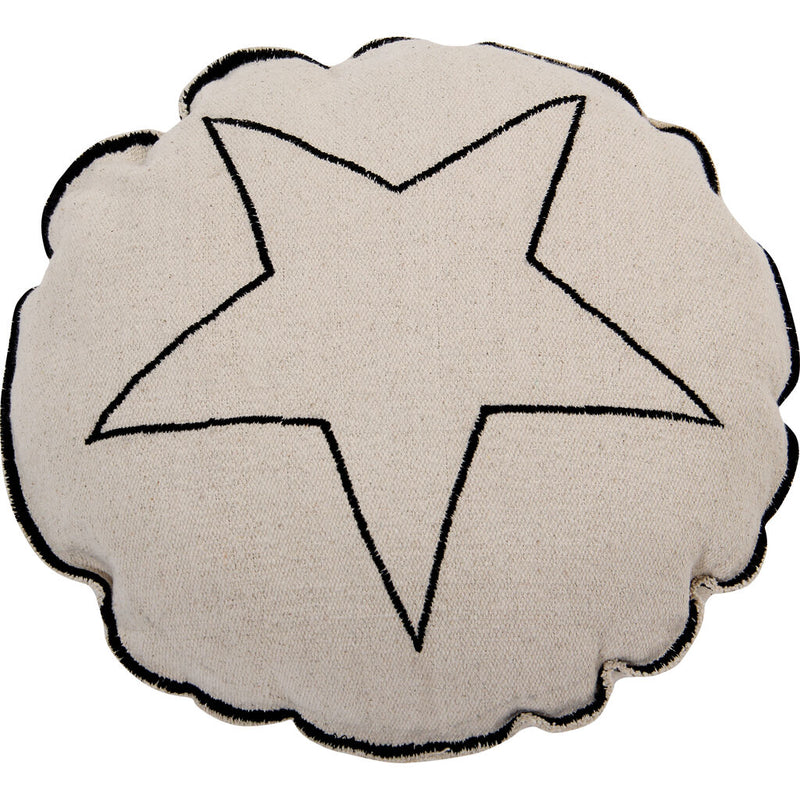 A simple but characterful design! A round cushion in compact 100% cotton fabric without any type of coloration and 100% polyester stuffing, with a large black star embroidered on the surface. The border is also skillfully finished in black creating a unique irregular profile. Its design makes it appropriate not only for children's settings and rooms but also other spaces such as the living room, couch, armchair, hammock, floor, bedrooms, etc. It is machine washable without needing to be uncovered since it is free of both zippers and buttons, something that also makes it child-friendly. It can be combined with Bereber and Trace rugs and the Baby wall hanging.