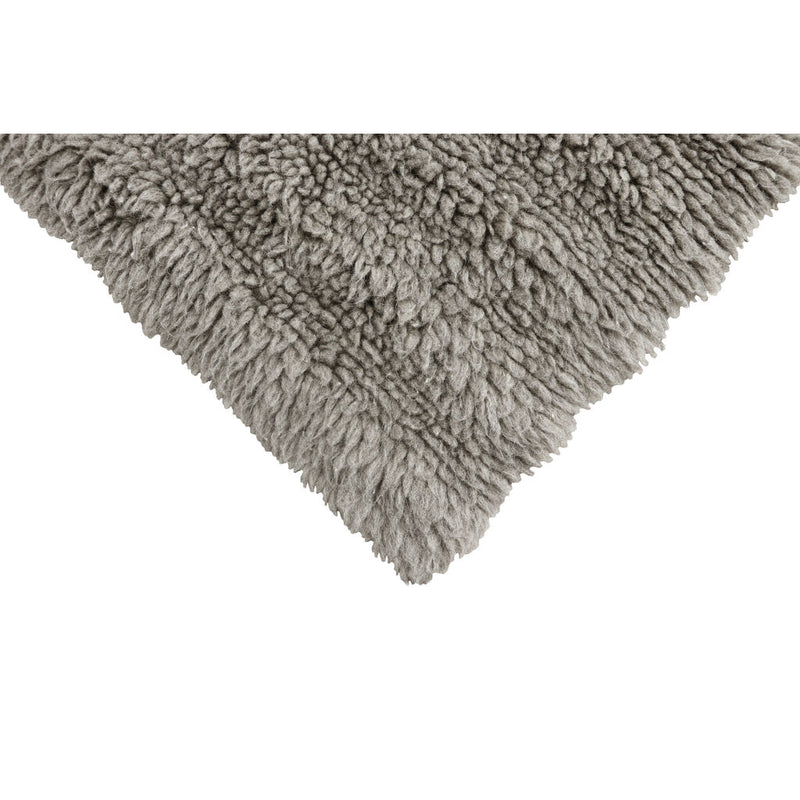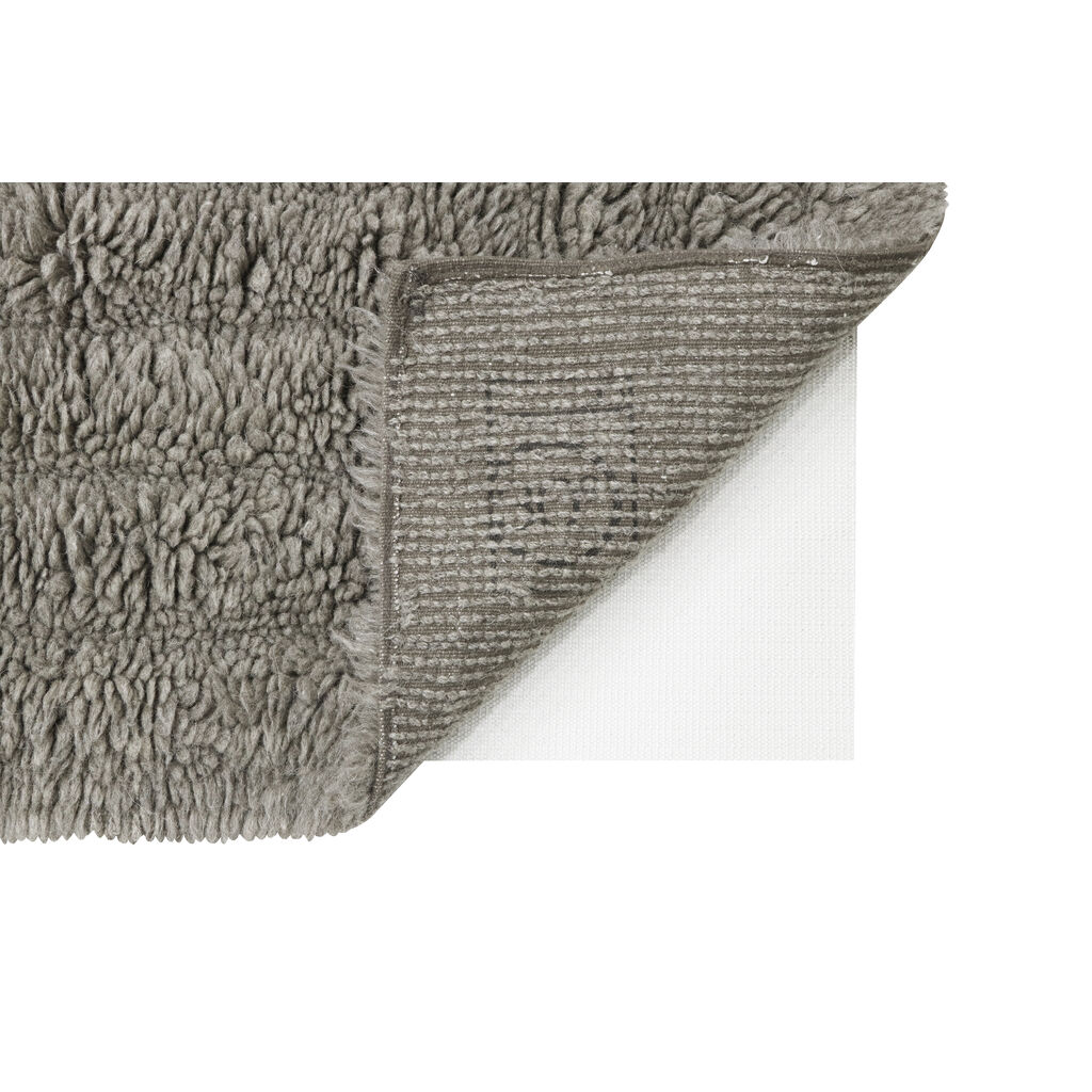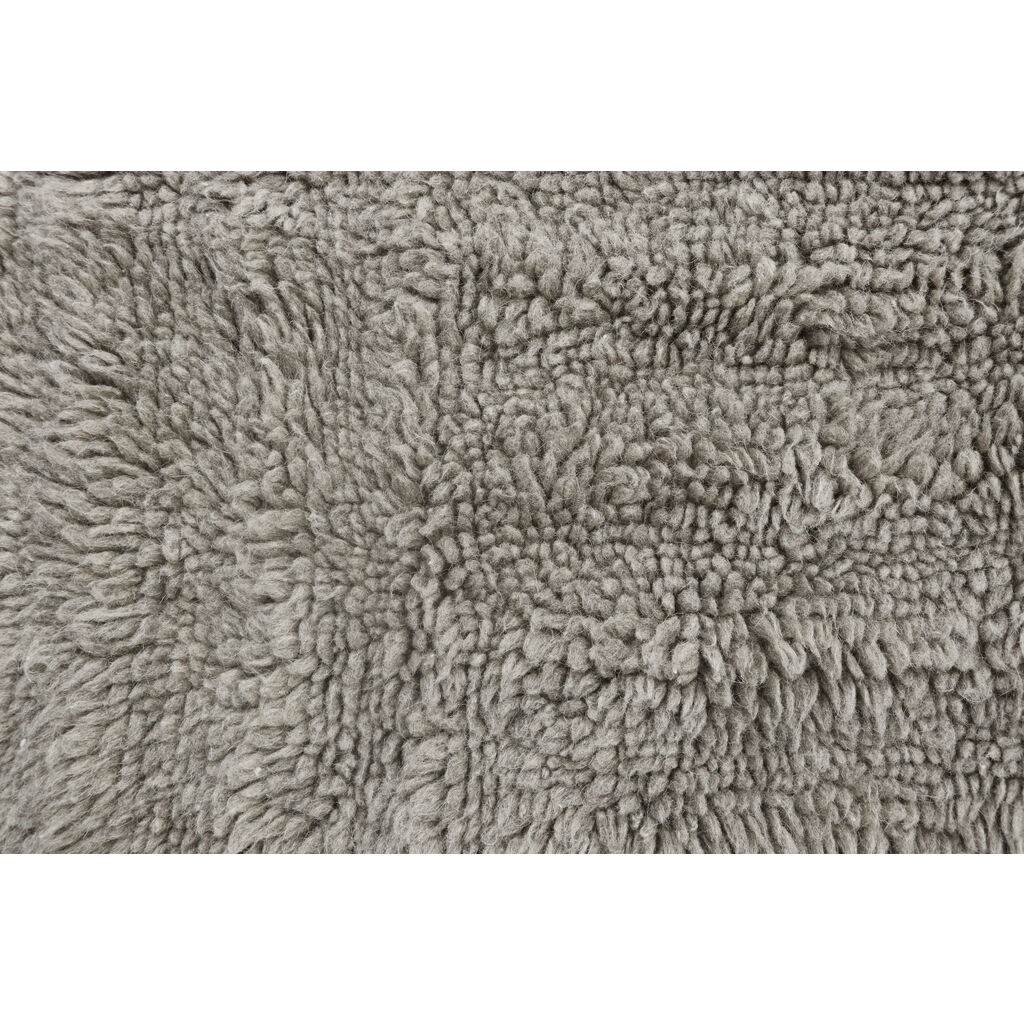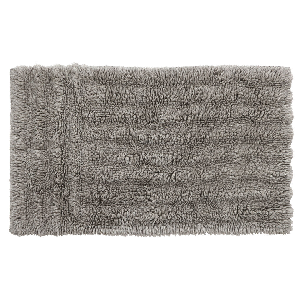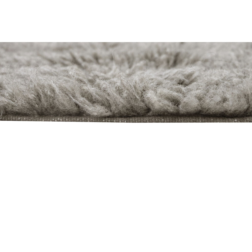 A fluffy rug whose surface texture is outlined by a gradient in the pile heights, evoking an undulating landscape, with lines meeting vertically and horizontally. Available in 2 different sizes, in natural grey undyed wool, sourced from Russian sheep, mixed with a 20% blend of New Zealand high quality wool. It provides a warming, soft tread as a bedside rug and an even cozier floor covering for living areas.