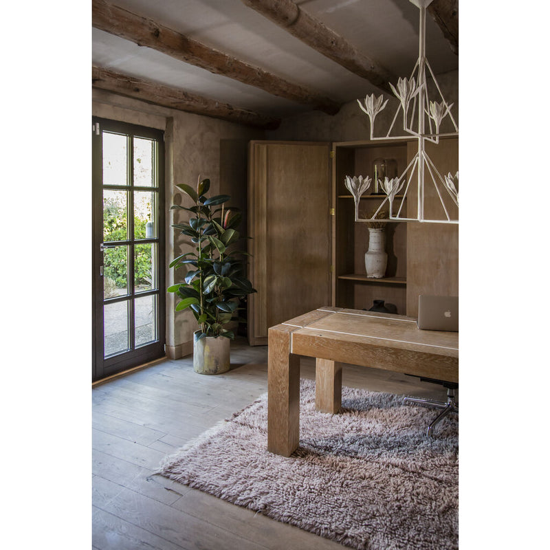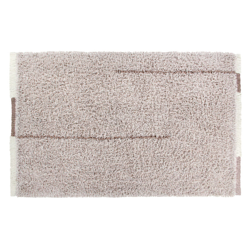 A fluffy, long pile rectangular and washable wool rug, in Misty Rose mixed with Natural, and with contrast lines in Quartz color. Uneven fringes at edges gives the rug a bohemian, hippie look. Spring spirit highlights the power of springtime, as the equinox, a new light and life fulfills your journey.