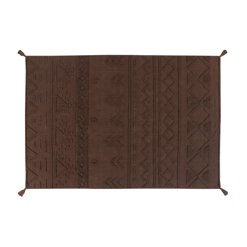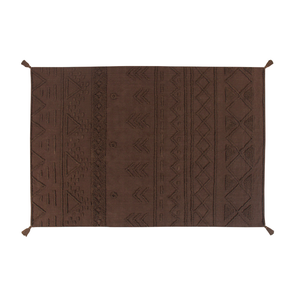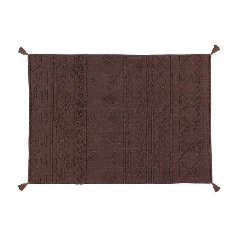 Rectangular cotton washable rug with visible melange color canvas base in Soil Brown and Natural, with tribal design pattern on top in Soil Brown color. Finished with a tassel in each corner. This natural cotton rug can be machine-washed. On a re-cycled dye-free cotton base it takes on the role of a canvas into which several black and natural colored lines are woven and arranged in ethnically-inspired shapes and borders. As there are just a few woven lines, most of the base is visible and takes up much less space, making it possible to create a larger size that fits into a washing machine. Due to its elegant color combination, this model easily fits in with stylishly decorated and refined ambiences, aiming at visual lightness and warmth, whether it is the living room, dining room, bedroom, terrace or kids room. Hand-crafted, with natural dyes and natural cotton.