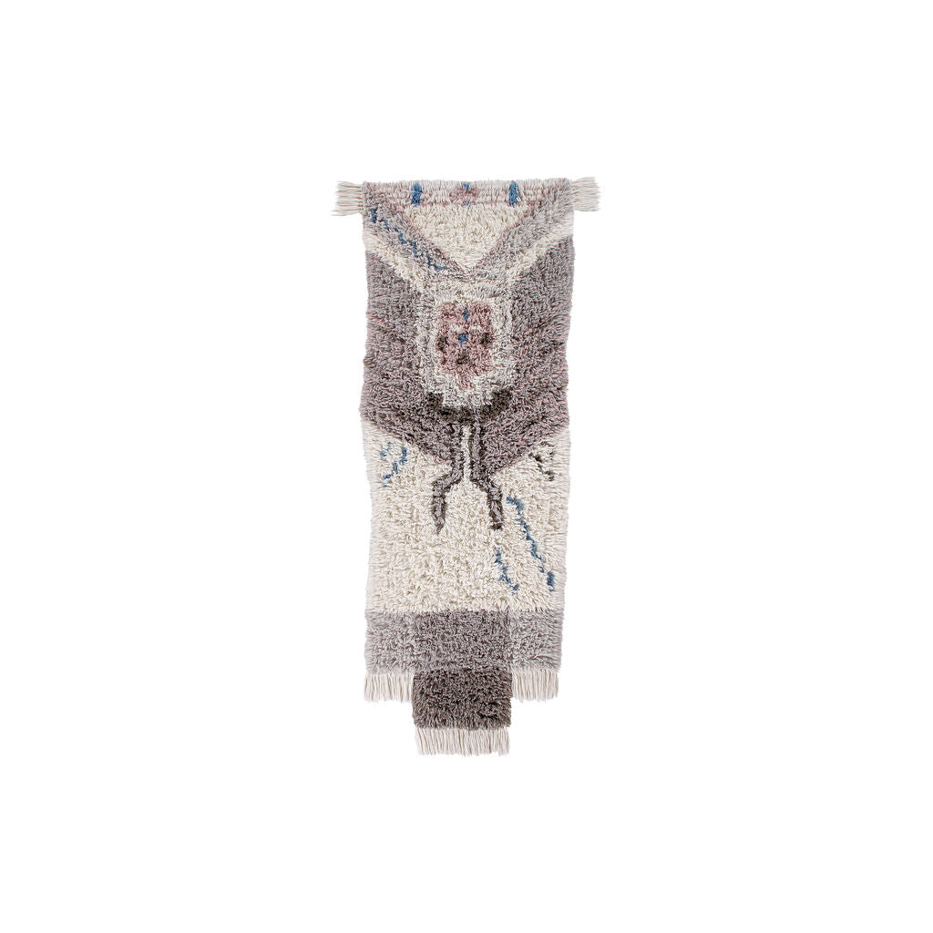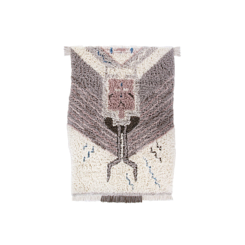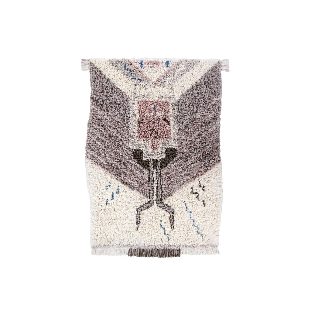 Inspired by the Hopi tribes' ancient handcraft traditions, in this case their emblematic handmade necklaces. This irregularly shaped rug with fluffy long and medium wool pile in soft color combinations, including Natural, Almond Frost, Silver Gray, Honey Dew and touches of Ocean Blue. Finished with one-knot messy wool fringes giving it a mystical and bohemian touch to the design. This design can be used as a rug or wall decoration. Ready to transform home decoration into a cozy and hippy area with a free spirit touch.
