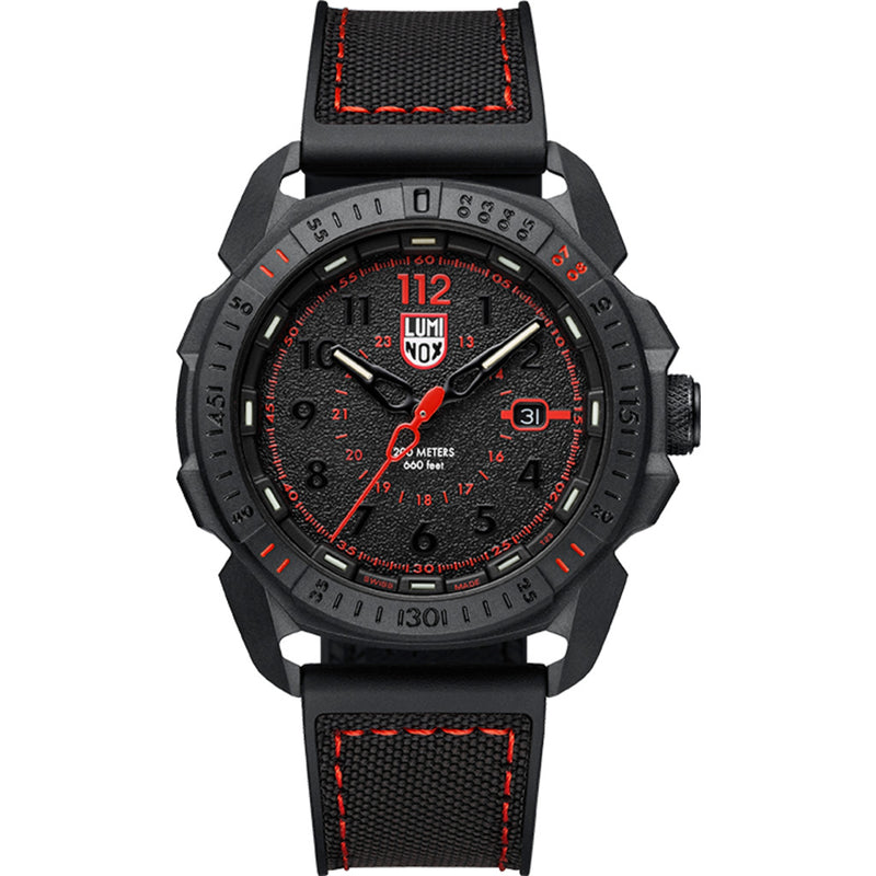 CARBONOX™, ufixed bezel, at 12h fitted with a protected orange light tube as well as hour and Minutes hands.