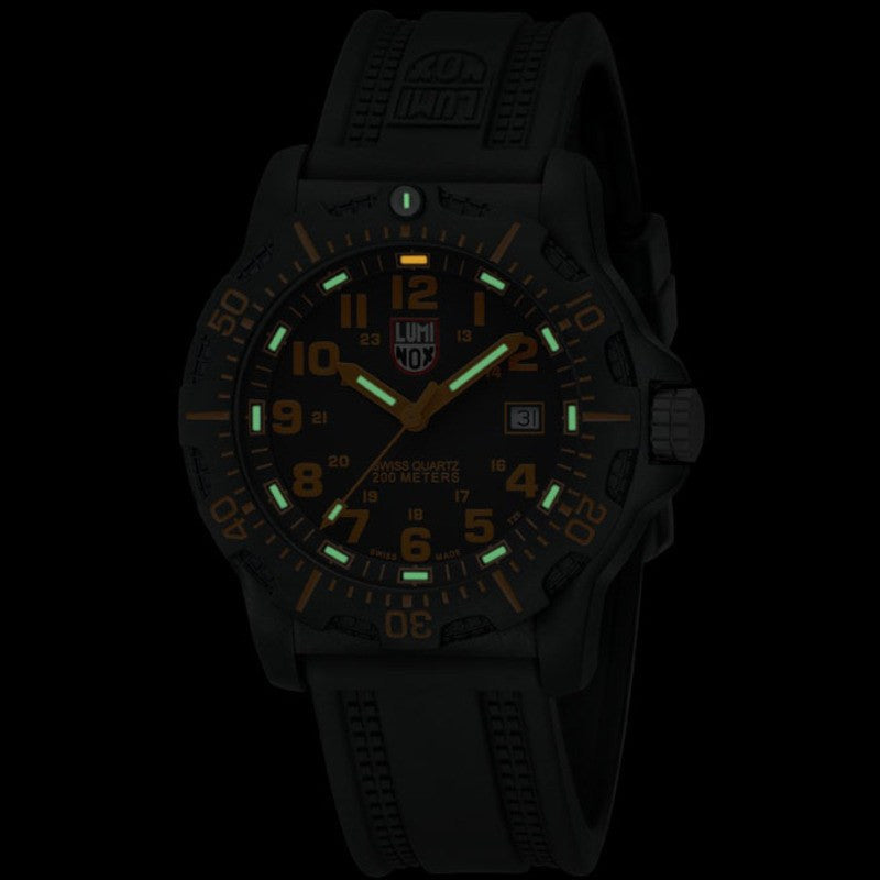 The stylish Luminox Black Ops 8819.GG features a sharp looking black dial with white accent orange luminous hands and Arabic numeral hour markers along with the night vision tubes (25 years), dual time and date display function, scratch resistant mineral crystal, and water resistant to 200 meters. Luminox 8819.GG is equipped with a 23mm wide black rubber strap with a buckle clasp.