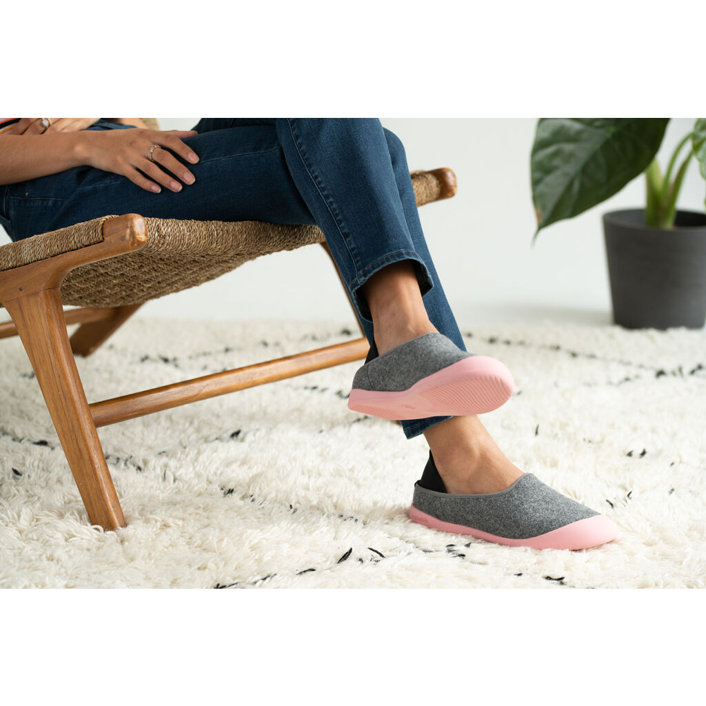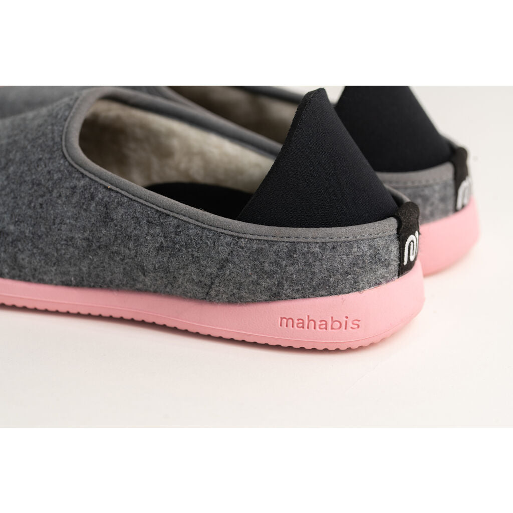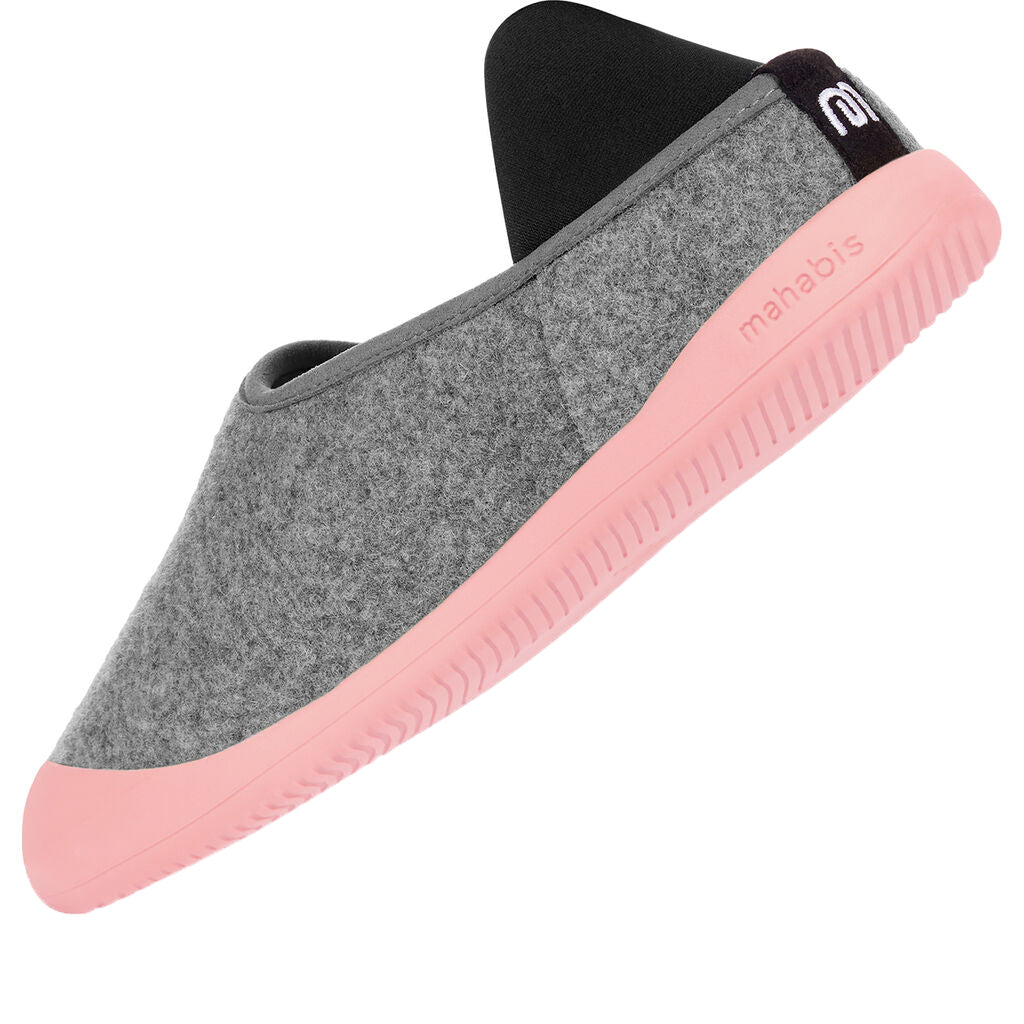 Discover the luxurious comfort of Curve Slippers from Mahabis. Designed to welcome you home. Feel at home no matter where you go with the Curve Slippers. These Europen style slippers have a Light Grey upper and Sakura Pink soles. These minimal slippers have a lightweight construction, sculpted foam in-sock, and luxurious Italian wool lining made with ReWooly™ a carefully recycled wool that gently compresses tired feet. Versatile rubber sole Mahabis use only responsibly sourced Pura-Latex™ rubber. Designed to improve shock absorption and grip. Made to last so you can enjoy your Mahabis for years to come. Suitable for all day wear, they have a durable sole that is made to last. These sleek ergonomic slippers make a great gift!