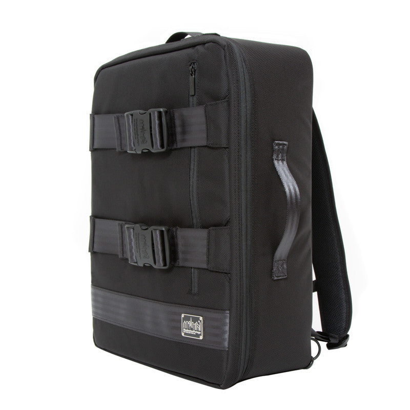 The Manhattan Portage Viewfinder Camera Backpack in black is designed for professional photographers and content creators, providing robust protection and exceptional organization for valuable camera and video equipment. It features a unique metal logo, front straps for tripod or skateboard attachment, multiple carry handles, tuckaway backpack straps with D-ring accents, and adjustable chest strap. The backpack includes a rigid exterior shell, heavily padded interior with customizable compartment dividers, and a flat zippered compartment, all made from durable 1680D CORDURA® Ballistic fabric.