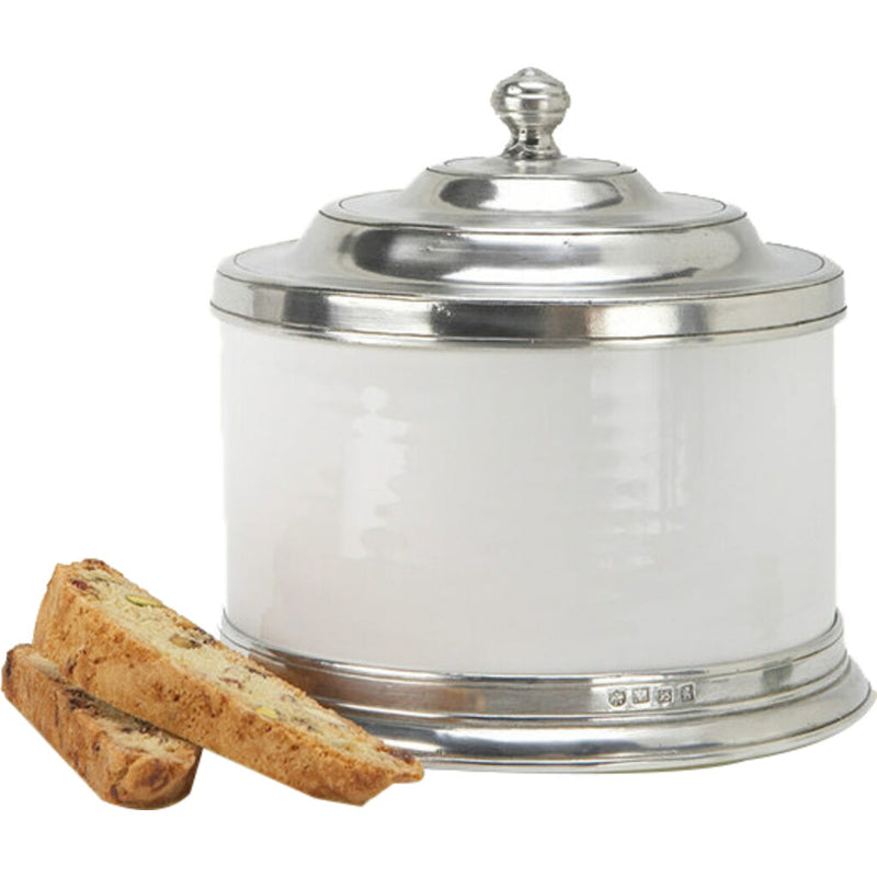 The beautiful white ceramic body of the Convivio cookie jar keeps your favorite sweet treats fresh and delicious with its tight fitting Italian pewter lid.