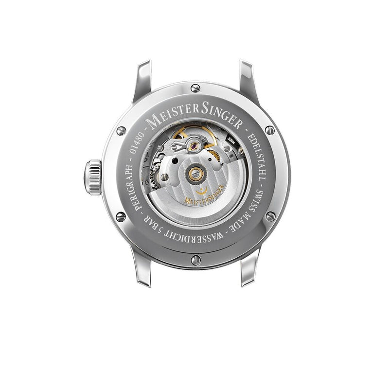 MeisterSinger often has a flair for the unusual when designing its single-hand watches and the Perigraph, which also features a date display, is no exception. The beautifully balanced date ring rotates freely around the center of the dial. A small arrow at 12 o’clock points to the current date, which advances one step each day at midnight. This analog representation of the date corresponds to the circular time display and provides just as much of an overview.