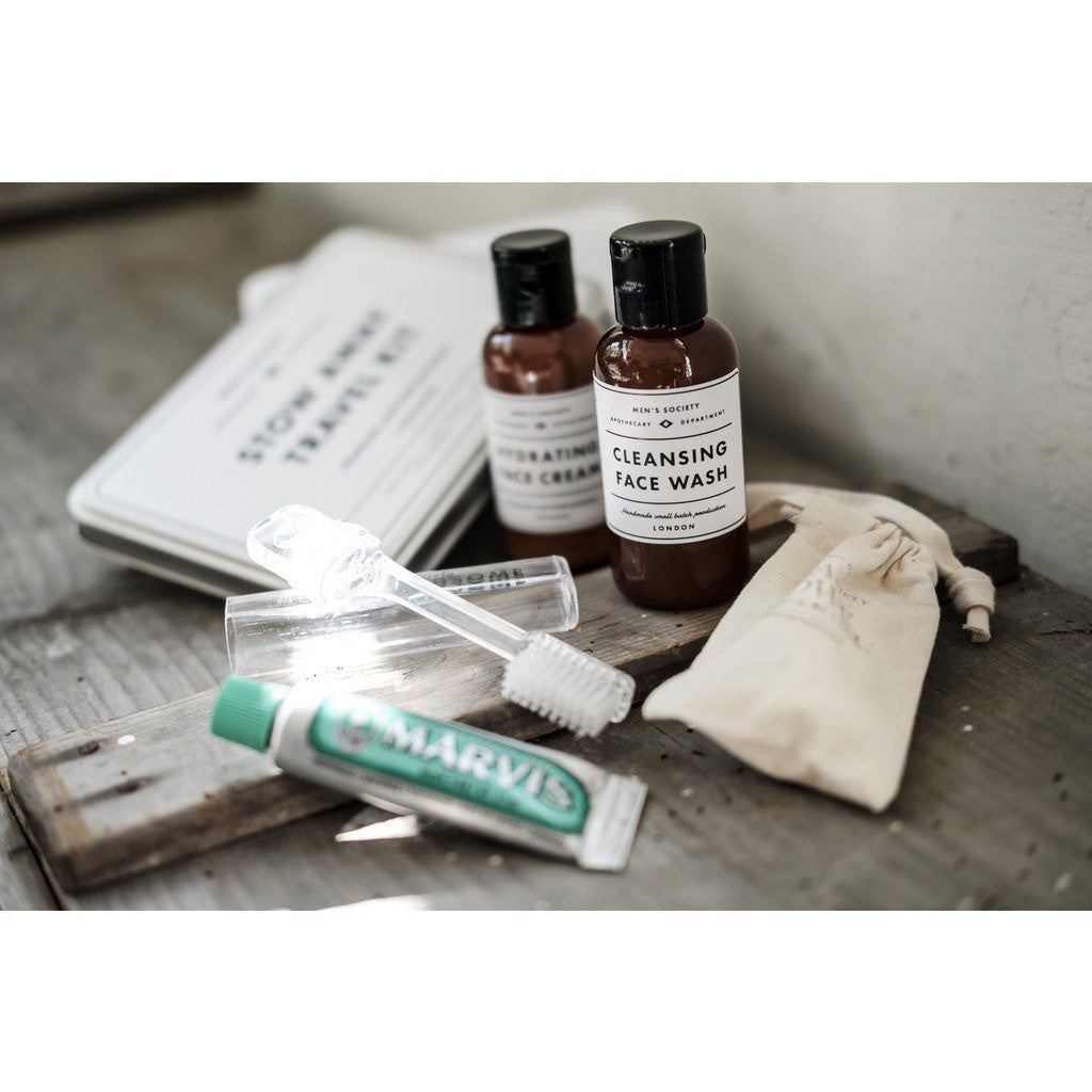 - Includes: Cleansing Face Wash. 50ml, Hydrating Face Cream. 50ml, Disposable face towels, Travel size toothbrush and Marvis toothpaste,