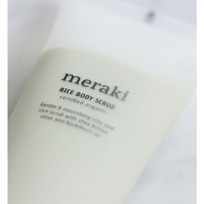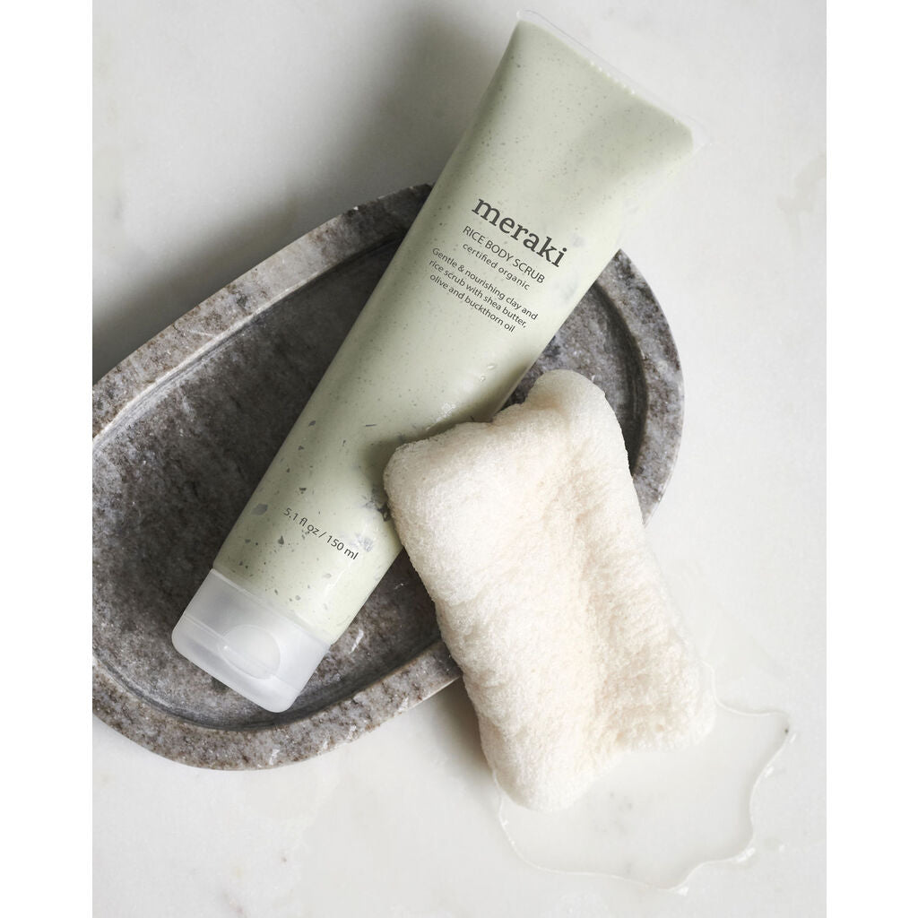 With its boosting blend of shea butter, aloe vera, olive, and buckthorn oil, this certified organic rice body scrub leaves the skin velvety and luminous. Shea butter has a high dose of Vitamin E which has a calming, hydrating effect while the oils soften and strengthen the skin’s elasticity. The natural exfoliants consist of delicate rice granulate that scrubs the skin gently and effectively, removing dead skin cells and enhancing the skin’s natural radiance. Suitable for all skin types. Simply apply the scrub, massage gently in circles, and wash off the remaining product. 150 ml.