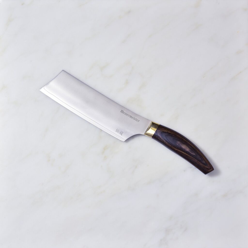 Our Messermeister Kawashima 6.5" Nakiri is a traditional Asian inspired blade, which has gained popularity for it’s thin blade and easy-to-use straight cutting edge. We have given the traditional shape a twist by incorporating a "Spanish point” to improve the utility in the tip. The Nakiri is a great choice for blazing through mountains of vegetables. Our cambered handle design gives you maximum control and hand clearance, while the straight edge makes positive contact on the cutting board.