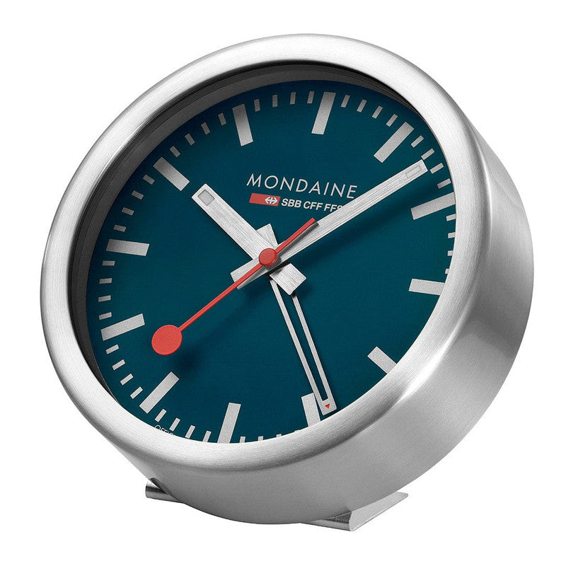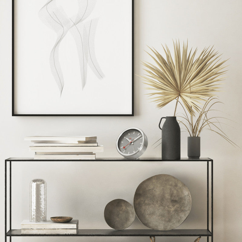 A modern decorative statement for your wall and desk. The timeless design of the Mondaine Swiss Railways Clock enchants in the 125mm mini clock with alarm function. Its 2-in-1 functionality allows this timepiece to be used as a table or wall clock. The aluminum case with hands and indexes of the same color gives every room a special touch. This new Mondaine watch is the perfect accessory for anyone who wants to wake up on time and in style.