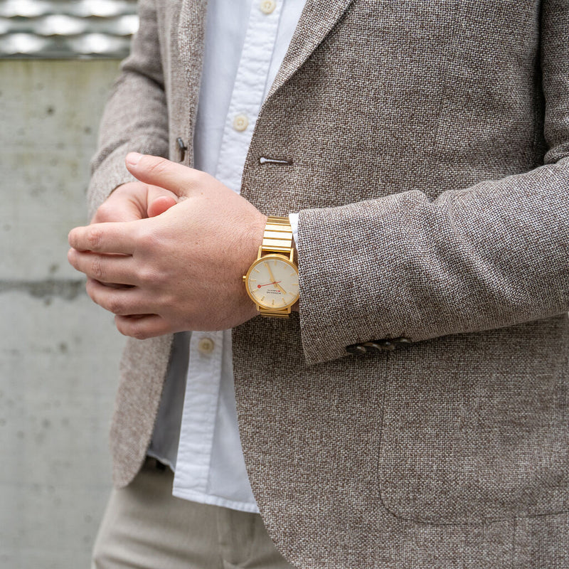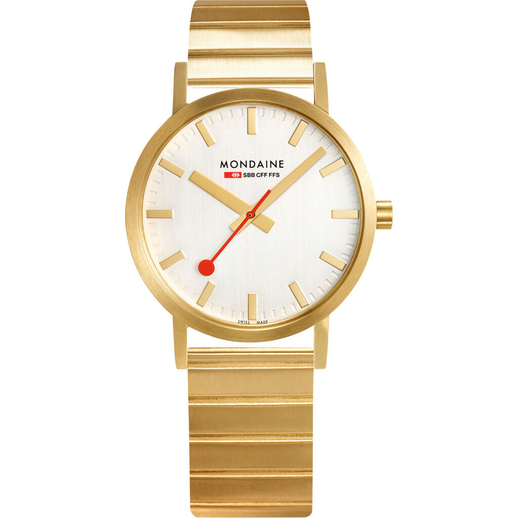 In 1986 Mondaine converted the clock's legendary face and bold hands into wristwatch form. This one-of-a-kind, easily readable watch has become one of the true design classics recognized the world over. The straightforward and unadorned shape of the case make this watch a true time icon. IP Gold-plated and brushed for a glamorous more opulent choice, this Classic timepiece is begging to be worn with flicked bangs and a flare. Even the SBB dial has been given a brushed silver metallic update with a sheen that gives extra highlight to the polished gold hour indices and hands. Debossed minute marks are an understated style hit that screams sophistication.