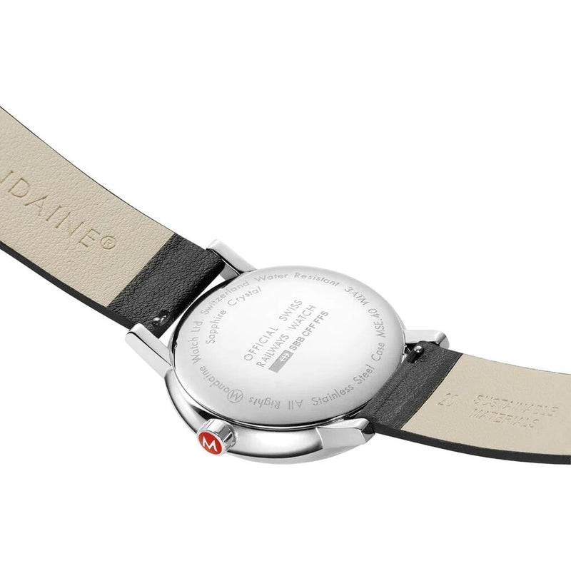 Evolutionary design. The harmoniously shaped case made of polished stainless steel of the Mondaine Official Swiss Railways evo2 promises maximum wearing comfort. The iconic design of this classic watch is characterized by the easy-to-read dial, which is rounded off by the large date display. The watch has a black vegan leather strap. The latter consists of 75% plant-based eco-composite material and 25% recycled PET.