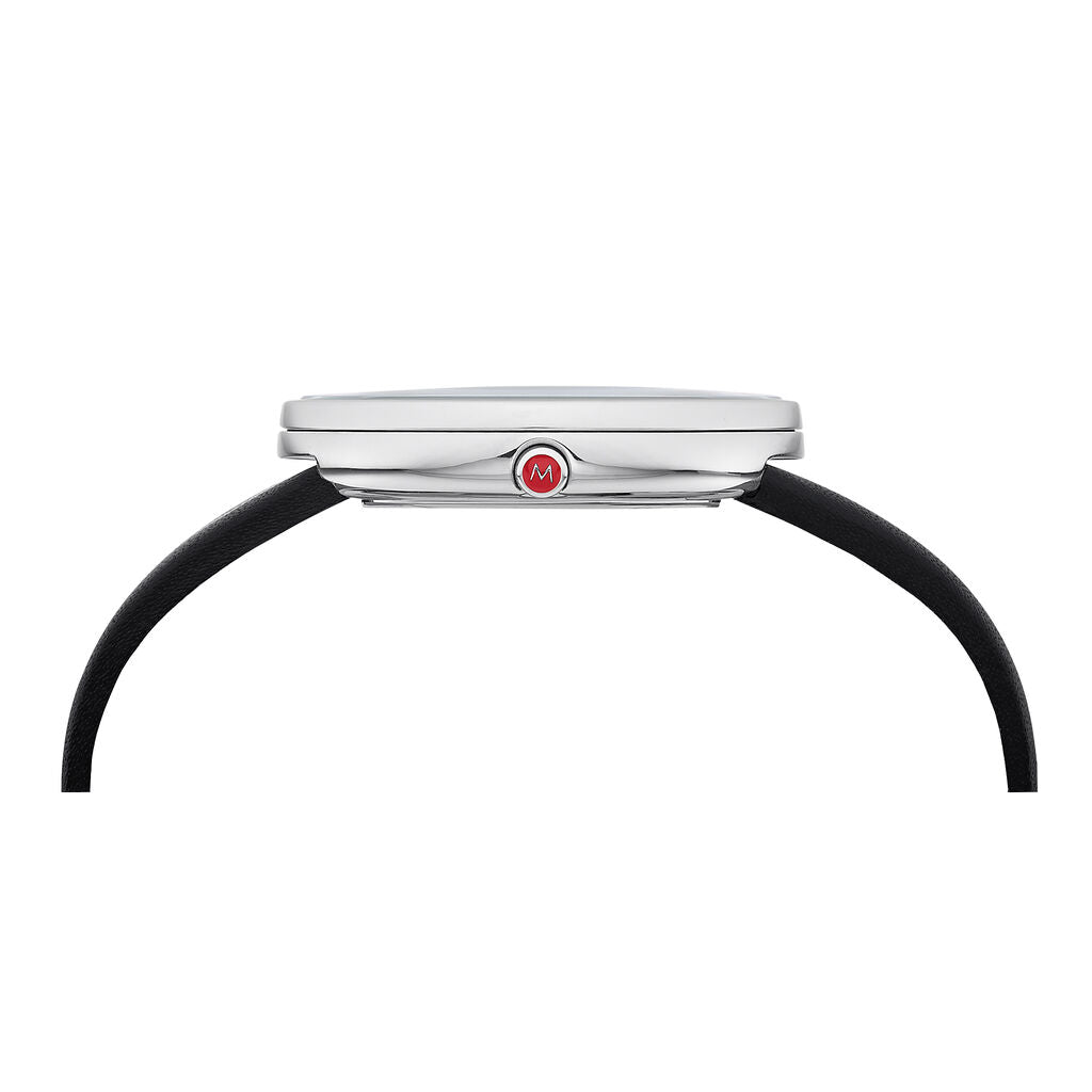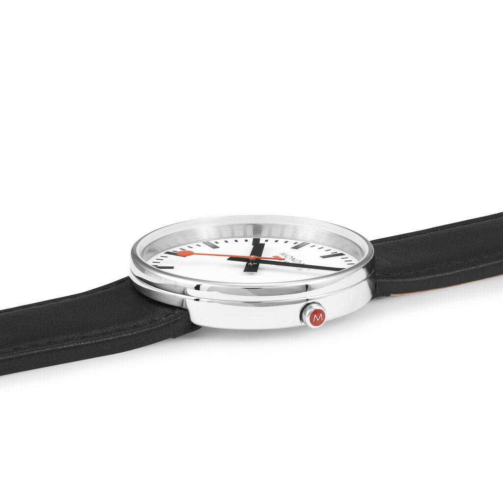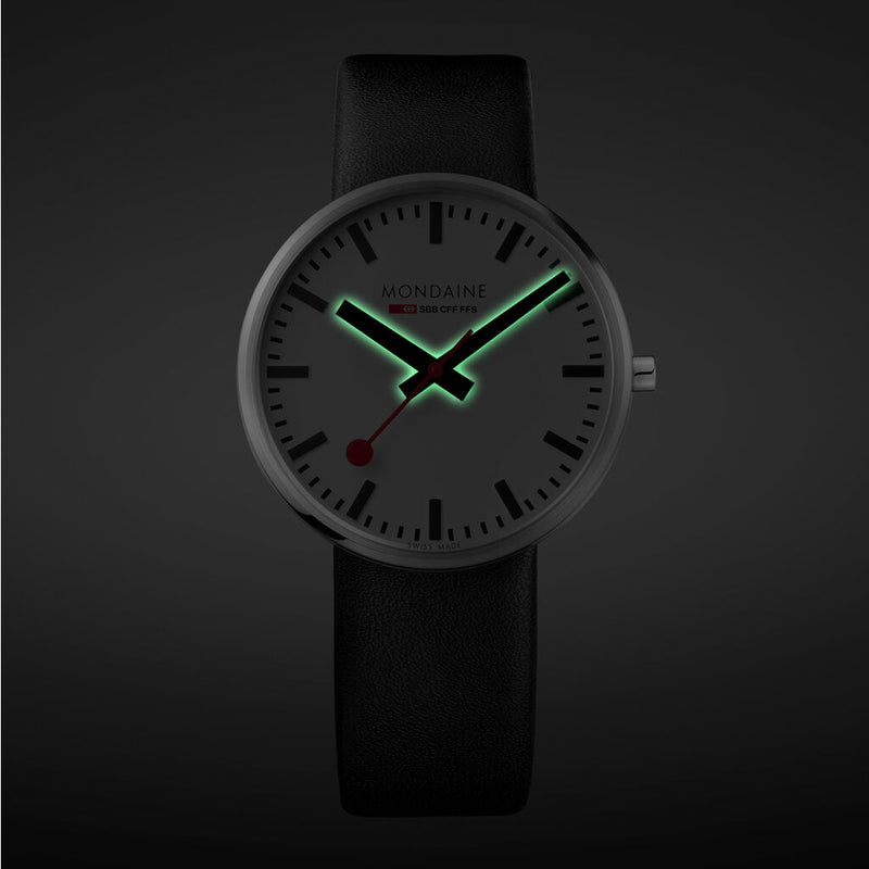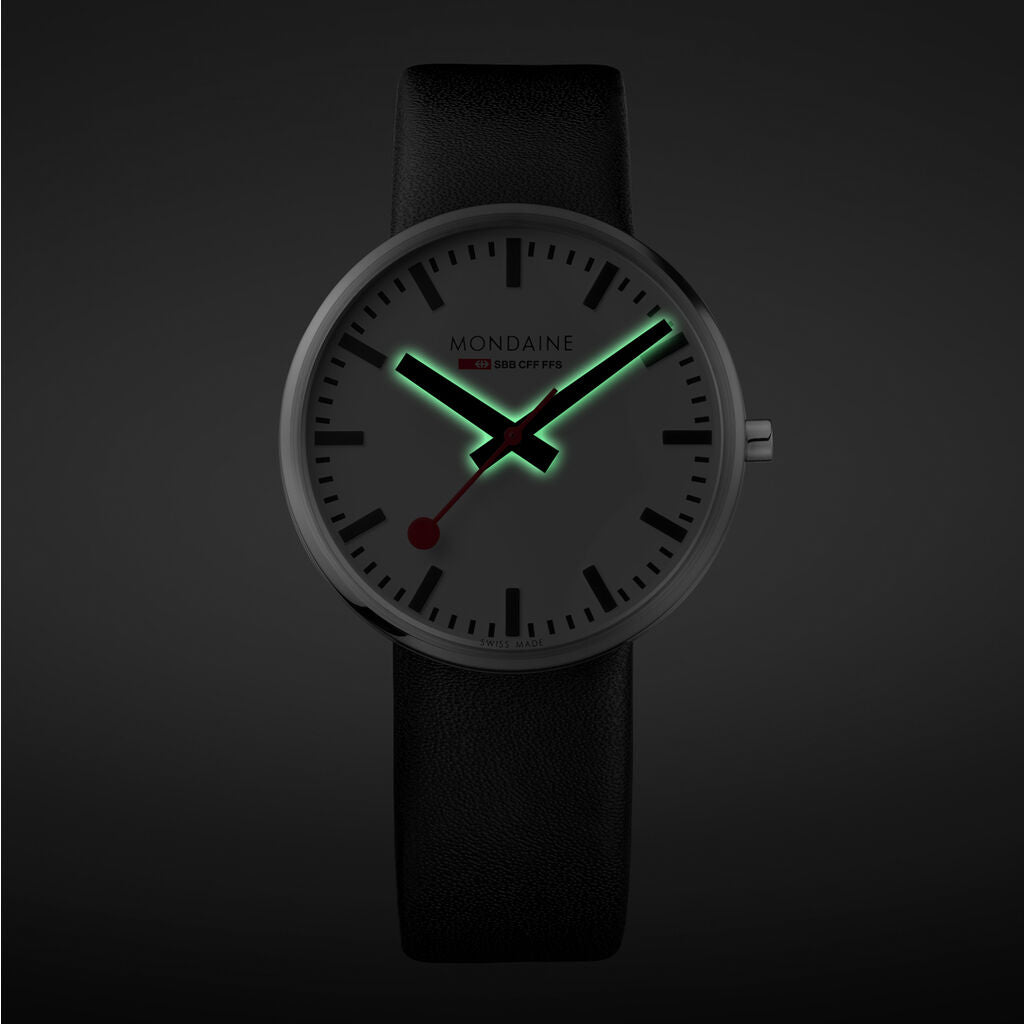 Light up the time This Mondaine watch with its timeless design is equipped with innovative BackLight Technology. The watchmakers made it possible to light up the iconic Mondaine railways clock dial without harming the design and without using any batteries. The underside of the hands glow in the dark and light up the dial so the time can be read in dark places too. The high-quality black leather strap completes the timeless design.