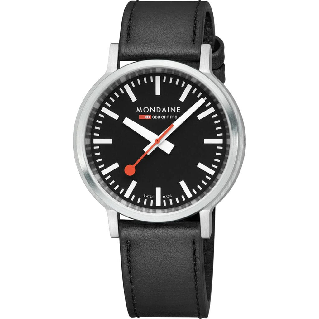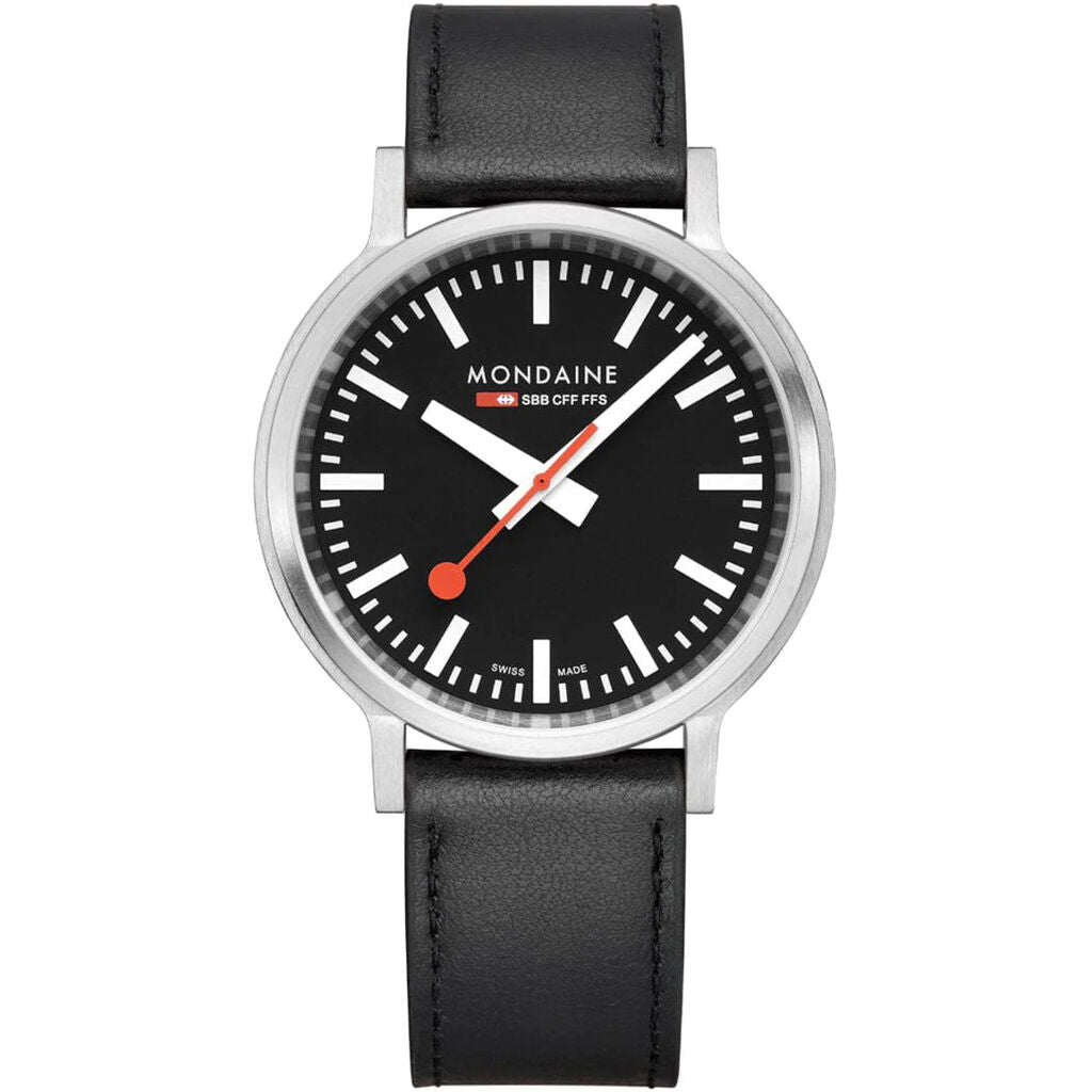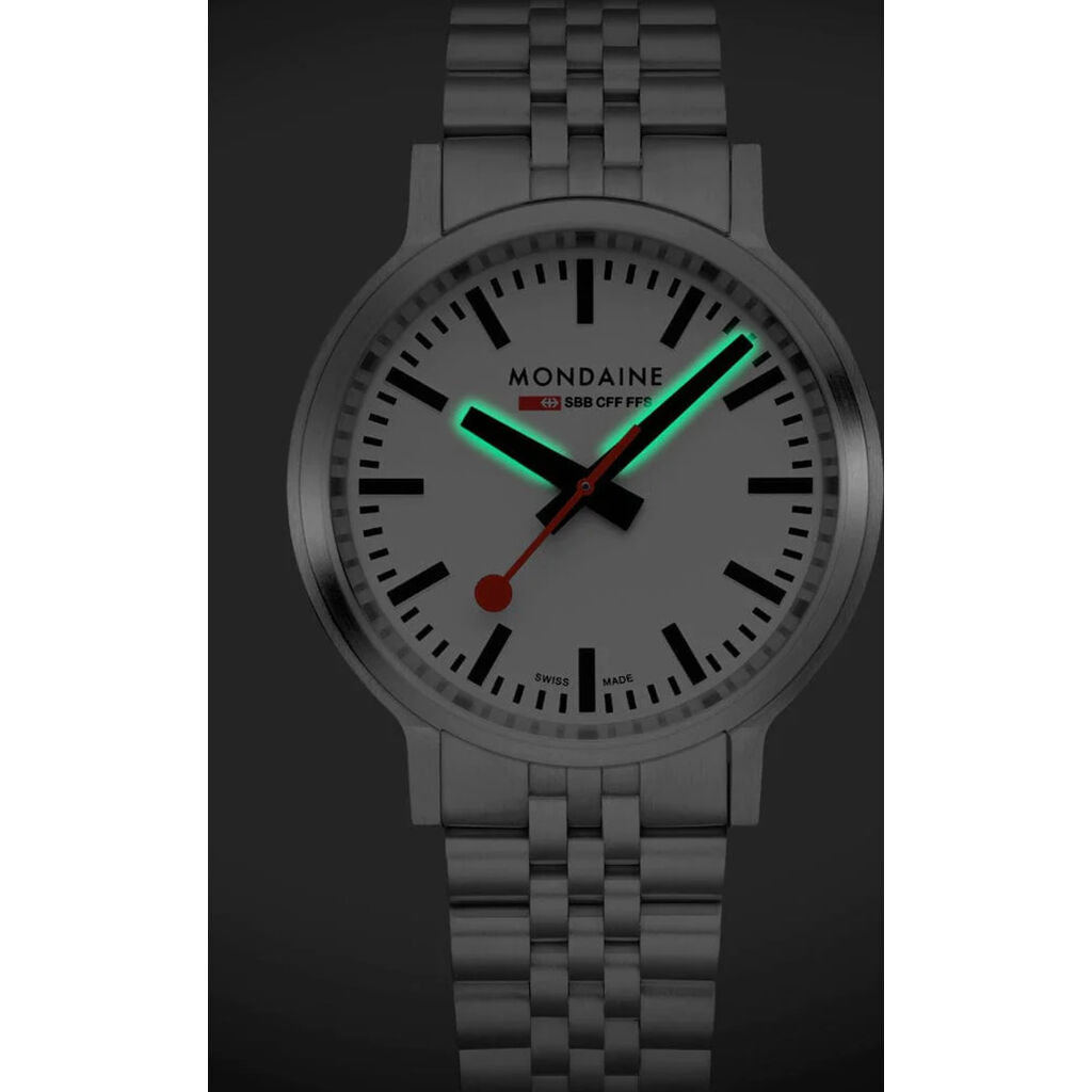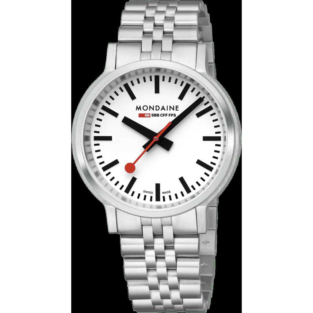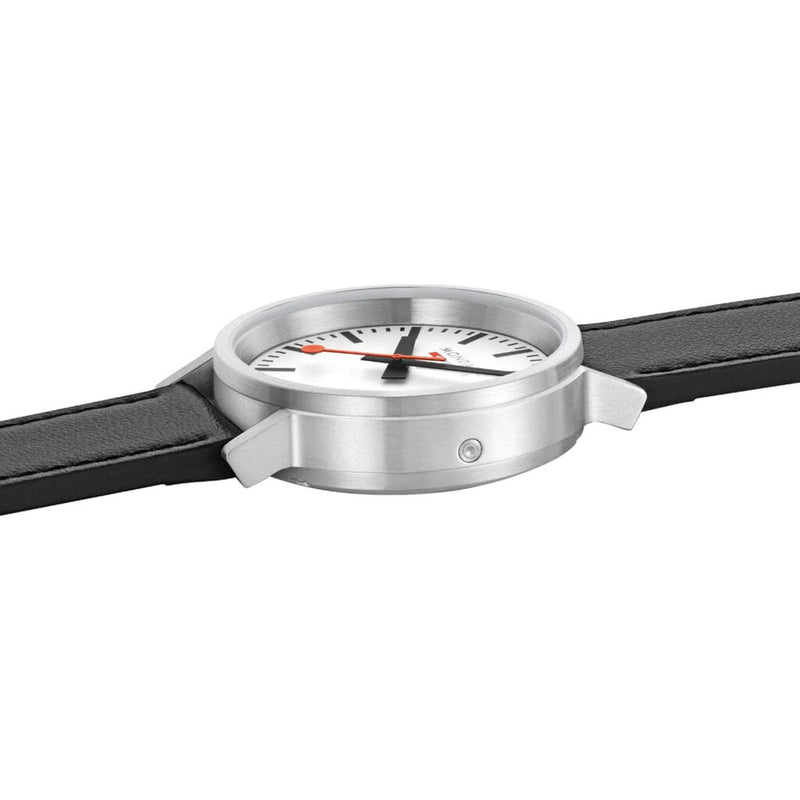 With its strikingly robust design featuring a crown-less case, the stop2go watch encapsulates the true essence of the iconic Swiss Railways station clock. The classic white dial and 41 mm brushed stainless steel case are paired with a stainless steel strap. Equipped with the exclusive and unique Swiss-made stop2go movement resembling that of the Swiss Railways clock it showcases a 2-second time stop. The watch also features the patented BackLight technology that lets the underside of the hands glow and allows the time to be read in darkness. The watch comes with a time-setting pen to easily adjust time and align hands.