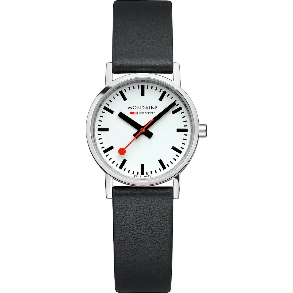 This iconic timepiece was first developed by the Swiss Federal Railways (SBB) for their train stations in 1944; and then launched by Mondaine as a wrist watch in 1986. The design has stood the test of time and remained unchanged ever since. Its simple and clear look reflects the influence of the Bauhaus style. A piece of Swiss history in your arm.
