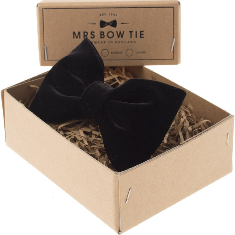 Mrs Bow Tie designed the Velvet Bow Tie with all black for a classic look. Pre-tied, this bow tie is constructed to maintain its shape. These bow ties are adjustable in size for ultimate comfort and quickly fasten with a hook and eye.