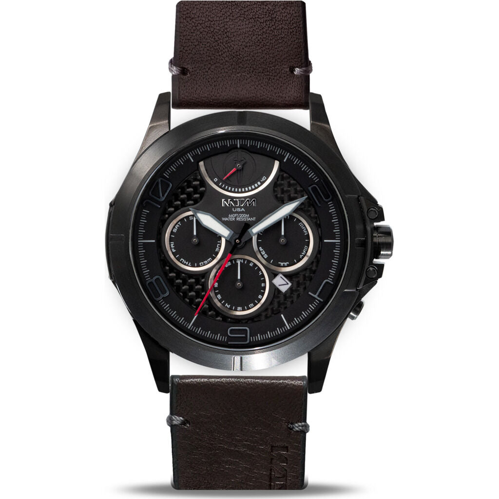 The exclusive MTM Black Oconus 42 with black leather band is the most stylish luxury watch for men.