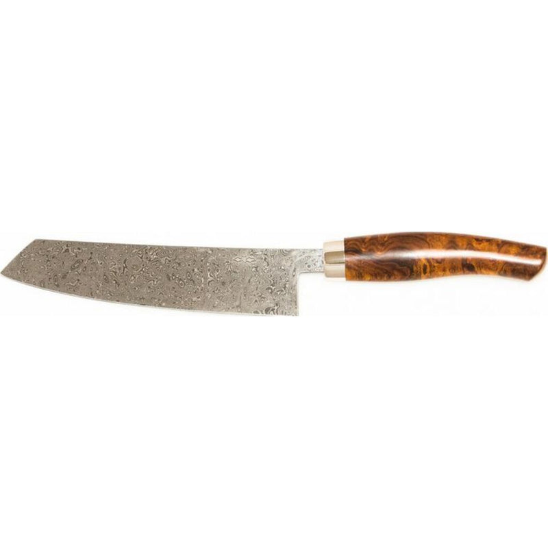 A NEW DEFINITION OF SHARPNESS: With the one sided grind, the hand forged damascus steel unleashes its full potential: From the combination of extremely fine carbon steel and an extremely thin blade originates an experience of sharpness that has no equal. FORGED BY A MASTER HAND:The craftsmanship of real damascus steel is shown by the different look of the damascus pattern: The back side of the blade is ground flat and shows a different structure than the hollow ground front side.- [Detail]