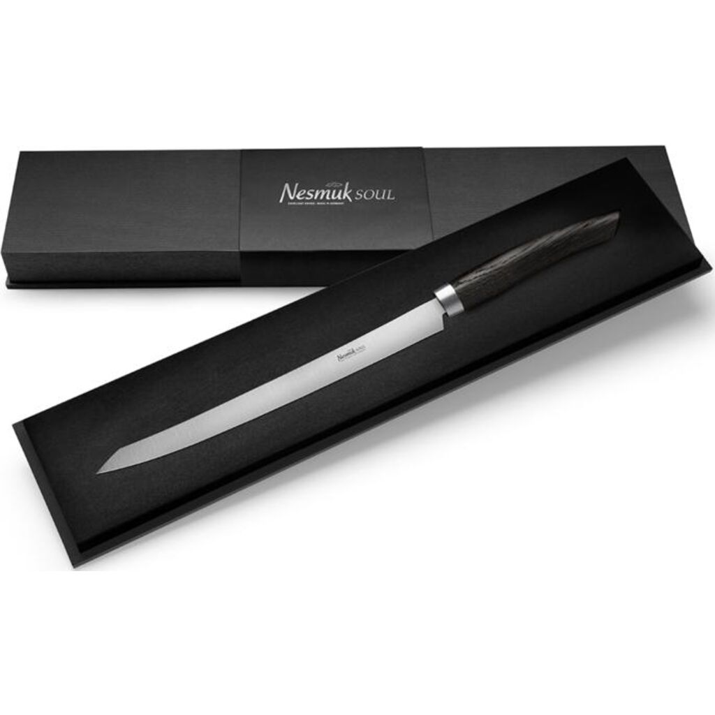 FOR HAM AND BIG FISH: The long Nesmuk Slicer is the perfect knife for the challenging tasks of preparation. With a blade length of 26 cm, the semi-flexible knife is ultra-light and ideally suited for long and precise cuts. This makes filleting large fish and cutting wafer-thin slices effortless. The niobium steel ensures high flexibility with the long and fine blade and at the same time conveys stability during vertical cutting. The properties of the steel allow an unusually high hardness of 60 HRC for filleting knives.