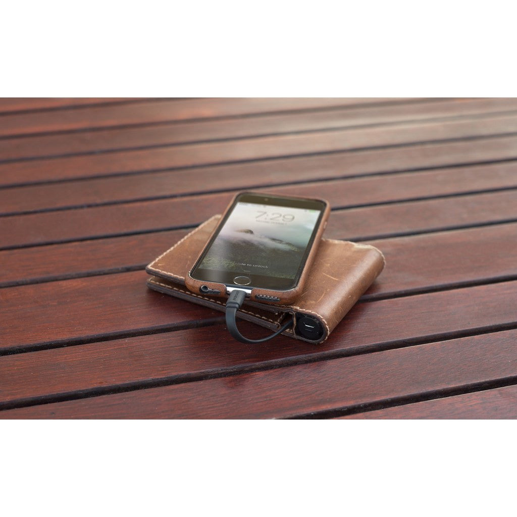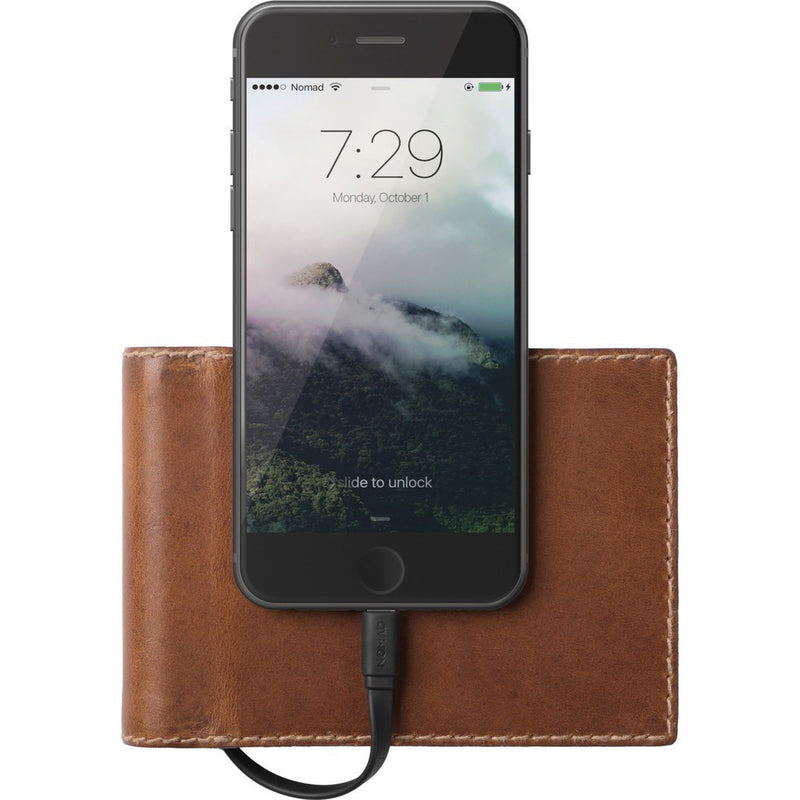 One of Nomad's most innovative and popular offerings, the Leather Bifold Charging Wallet brings together ubiquitous phone charging power with a classic, stylish wallet. With this case your phone will never run out of power, and you'll never be caught in a bind. Crafted with high crush strength aluminum casing and high strength polycarbonate caps, the electrical components are durable and resilient enough to handle daily use. Nomad turned to one of the oldest and most renowned tanneries in America, the Horween Leather Co. in Chicago, for their prestigious, elegant vegetable tanned leather. This leather develops a unique patina over time, darkening and growing richer so that you'll have a case that is wholly distinct, with a rustic, classic aesthetic. Simple yet richly classic, this wallet synthesizes old worlds and new for a groundbreaking experience.