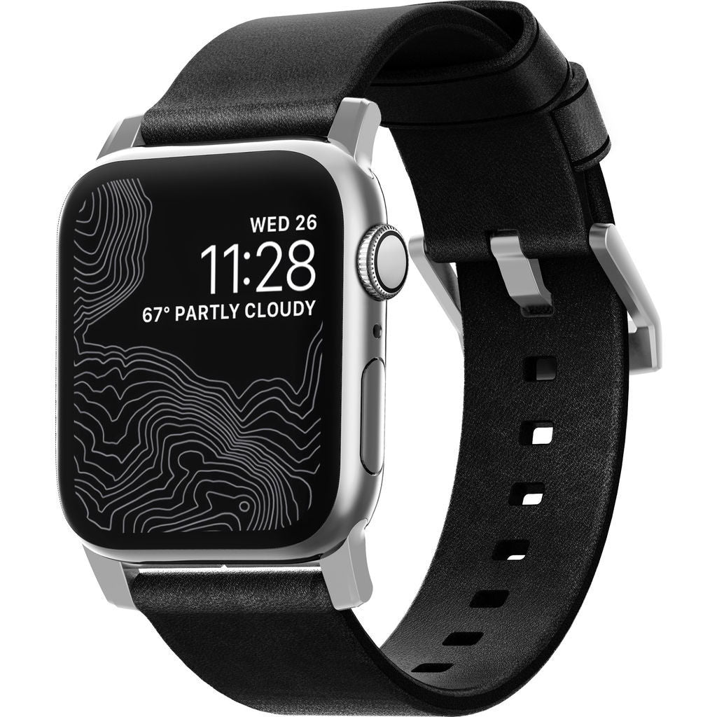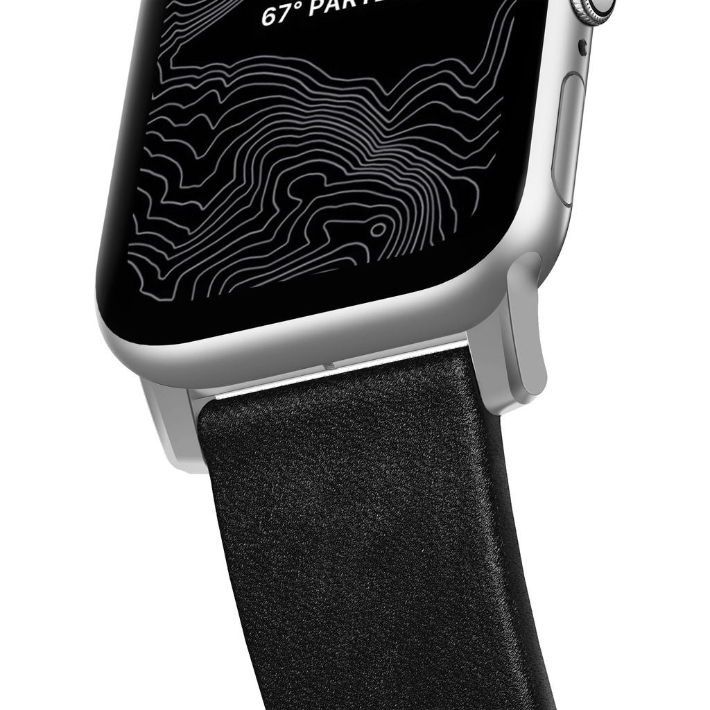 Nomad's Modern strap for Apple watch has a black leather band with silver hardware accents for a simple and bold look. Crafted from minimally treated, vegetable tanned leather from one of America's oldest tanneries, Horween. This trusted leather is designed to beautifully patina with time, creating a handsome, rich leather strap with a look that is uniquely yours.
