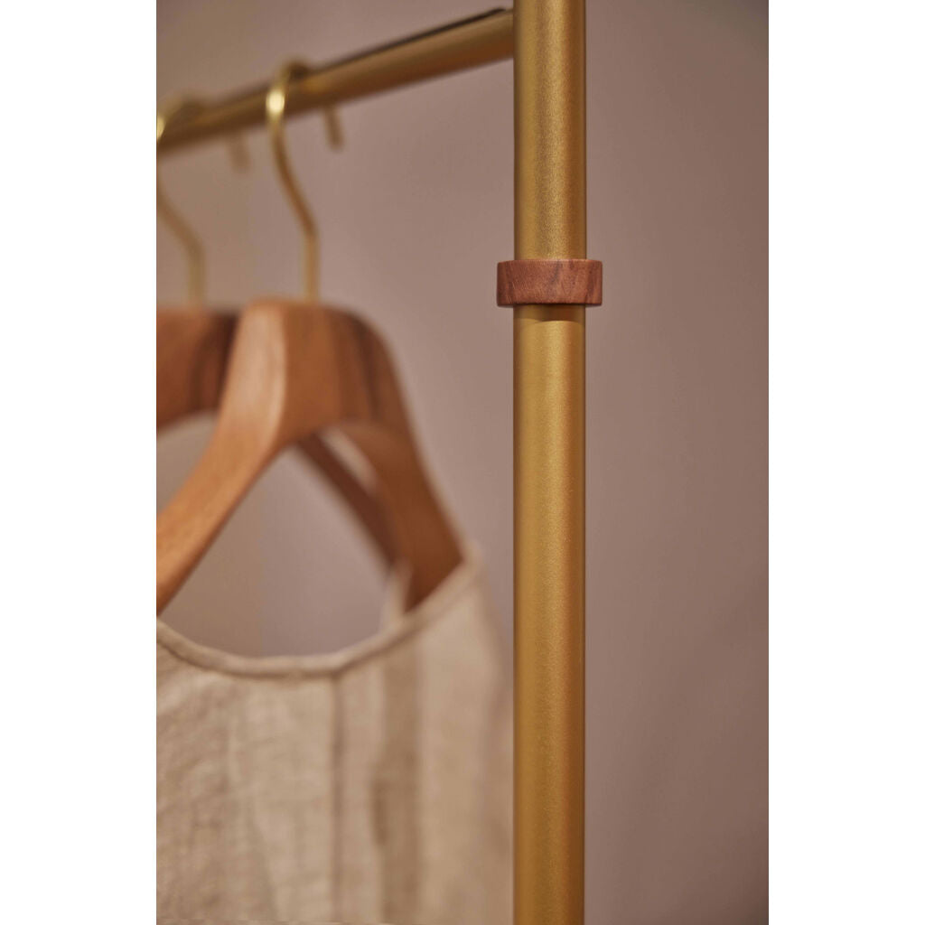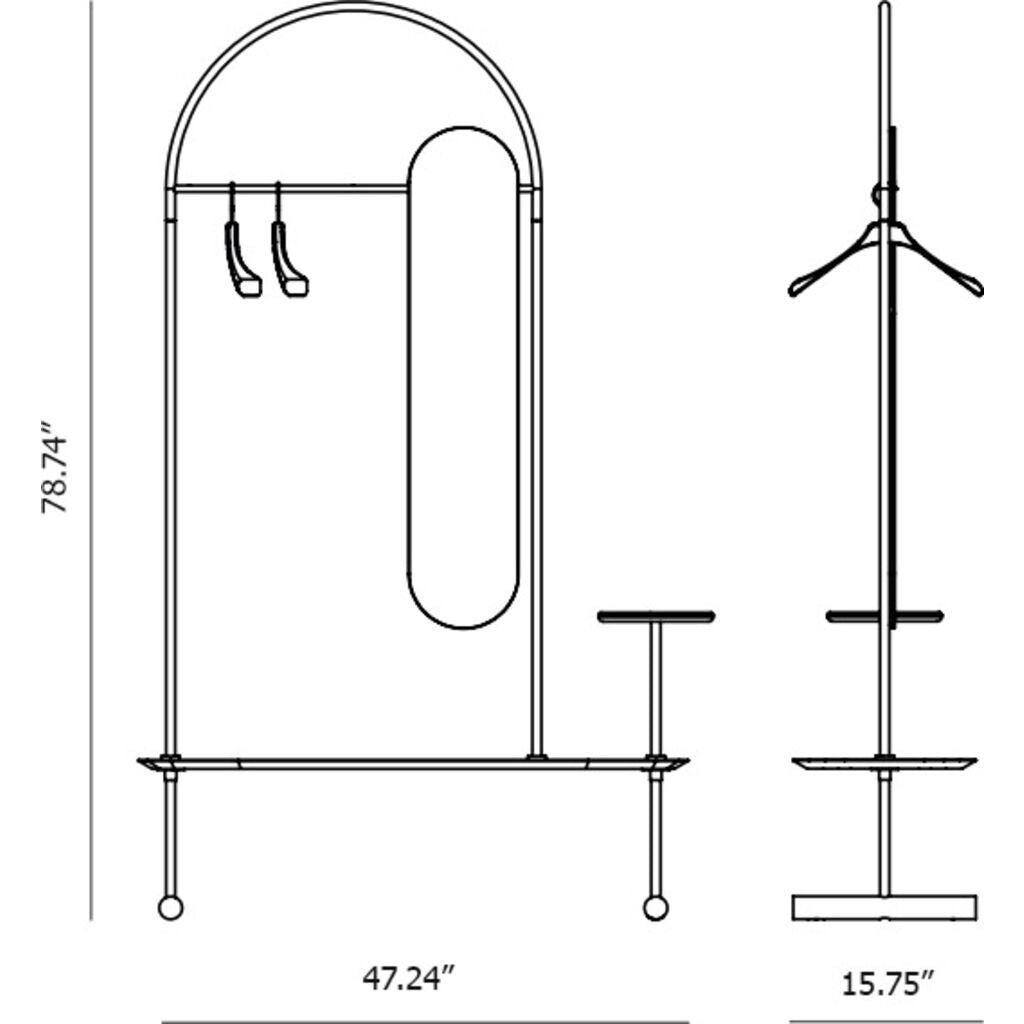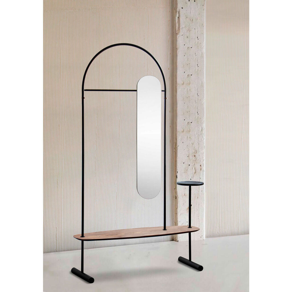 Elegant and minimalist, the Arco Clothing Rack includes a long oval mirror, wood veneer shelf, a small tray and two wooden hangers. Designed and produced in Spain with natural materials and organic shapes, the clothing rack is available with either a brass metal structure and small tray in walnut or black metal structure and small black marble tray. A contemporary yet timeless piece to dress any space.