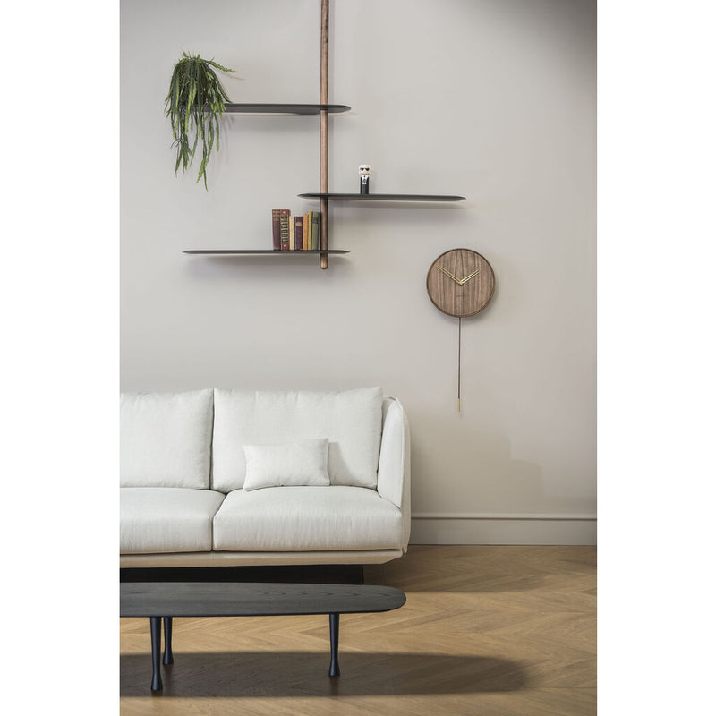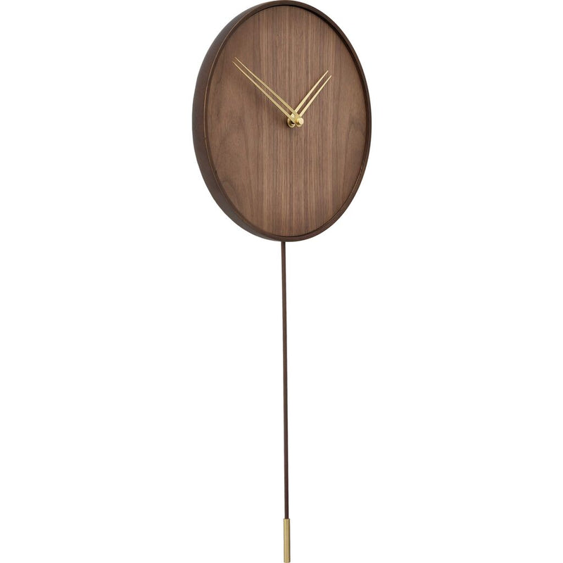 ø34 cm and 80 cm length clock, which combines the warmth of walnut wood and the movement elegance of a classic pendulum clock. Solid walnut finish, chromed brass hands and pendulum. Nomon creates innovative clocks and furniture that combine purpose and prestige.