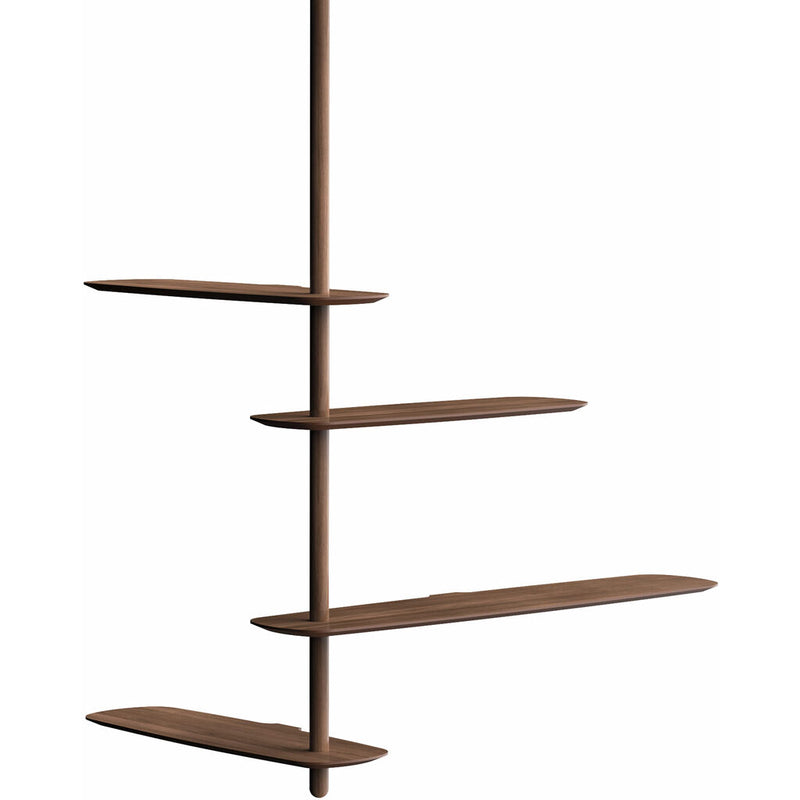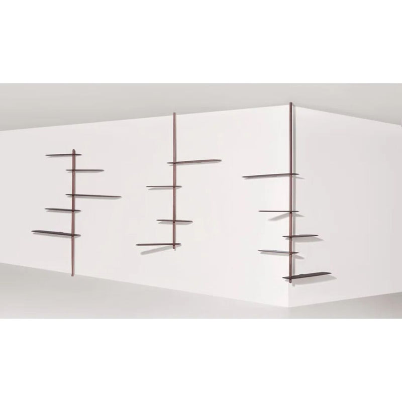 The Unica Ceiling-Mounted Shelving System invites the user to participate in its design. Configurations 5, 6, and 9 feature a floating shelf that can be swung to the right or left to suit your needs while Configuration 7 features four fixed position shelves. A central rod hangs from the ceiling and stabilizes the shelves which are fixed to the wall or floating. Configuration 9's shelves can be arranged around a corner. This functional, visually unique design offers fresh, modern style for your space. Assembly required.