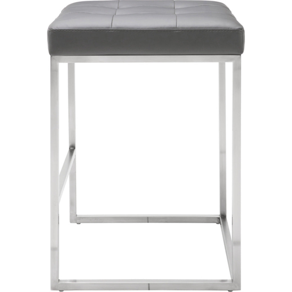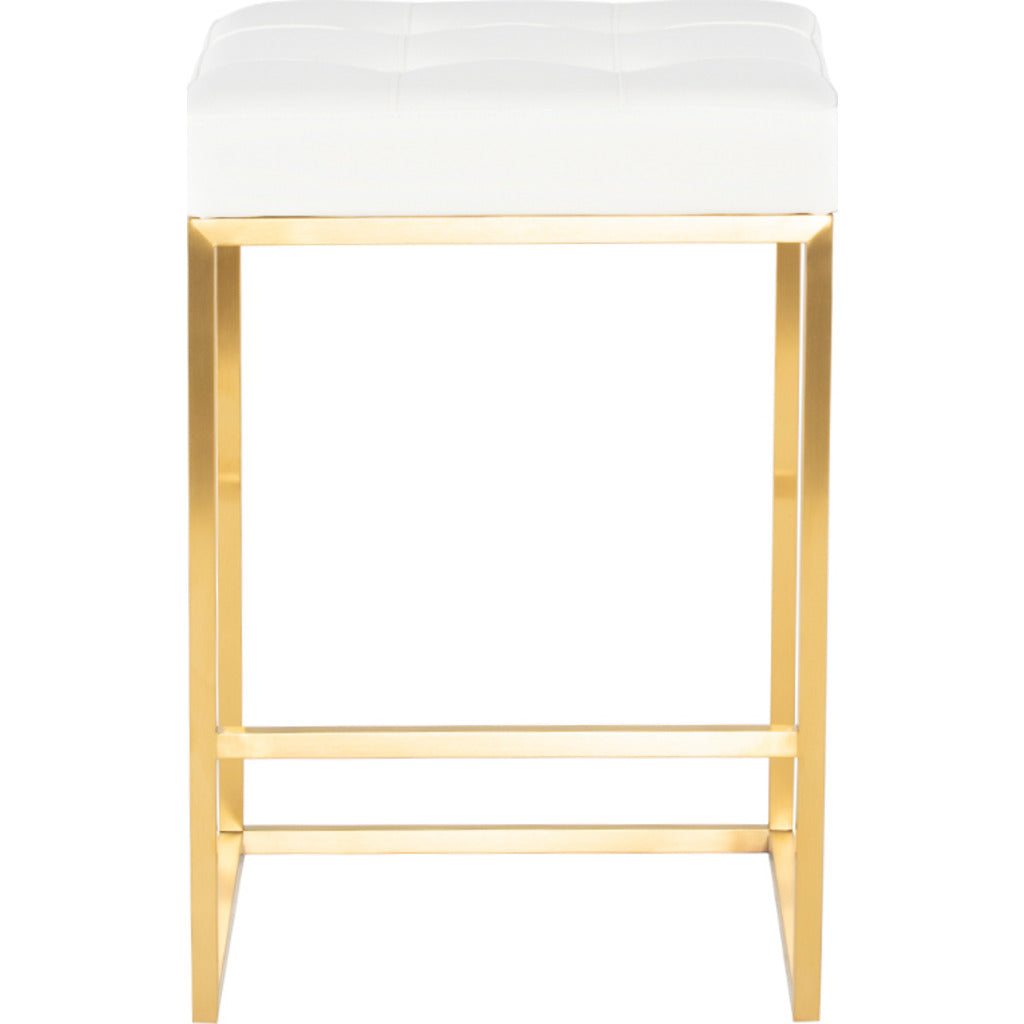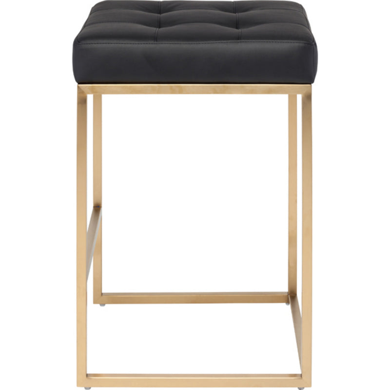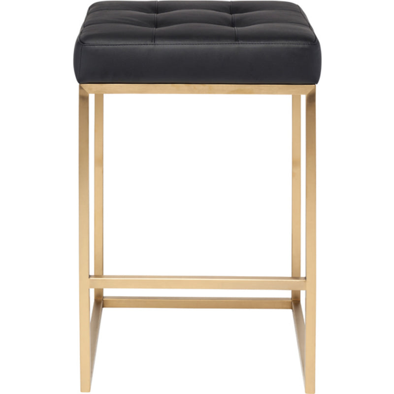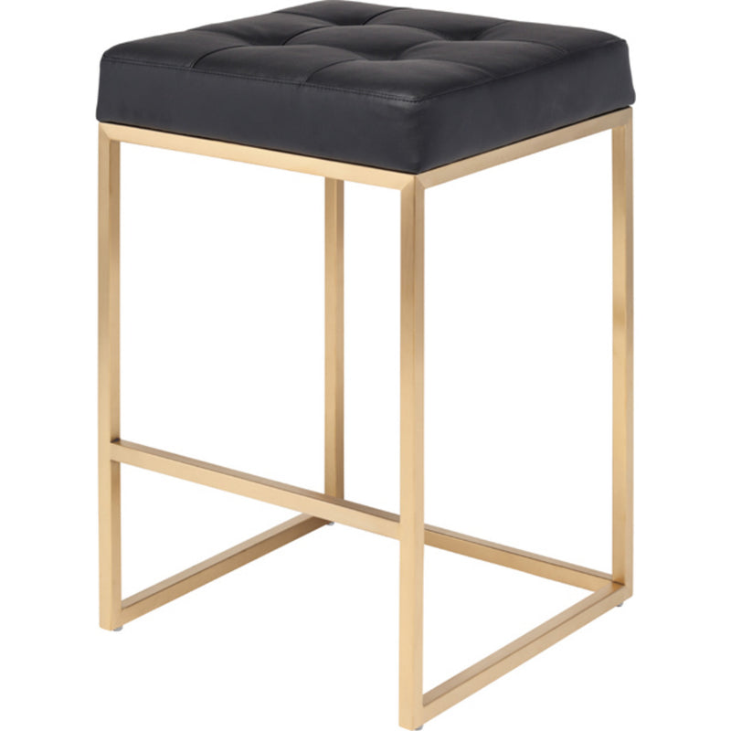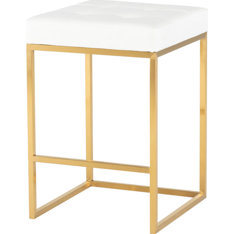 The Chi counter stool is an ideal example of simple elegant modern design. The brushed steel & gold stainless steel frame, including fixed foot rest, uses a bare minimum of materials in its construction creating an exceptionally light effect. The stool is topped with a dense form fitting tufted naugahyde seat cushion for added comfort.