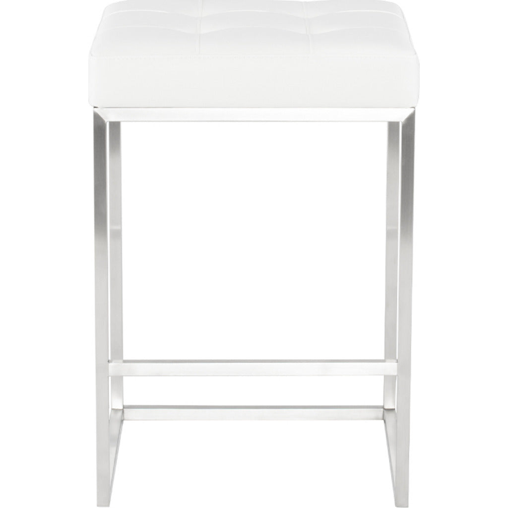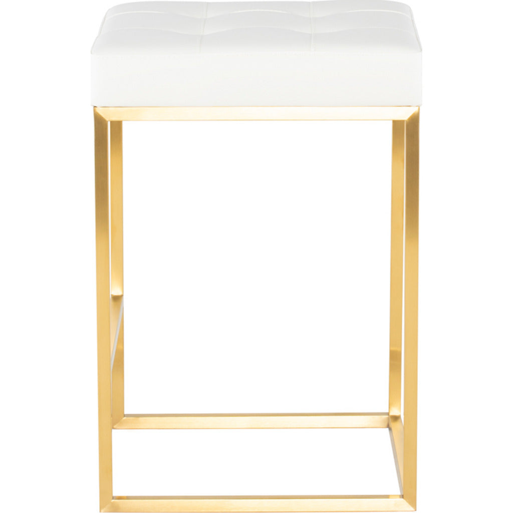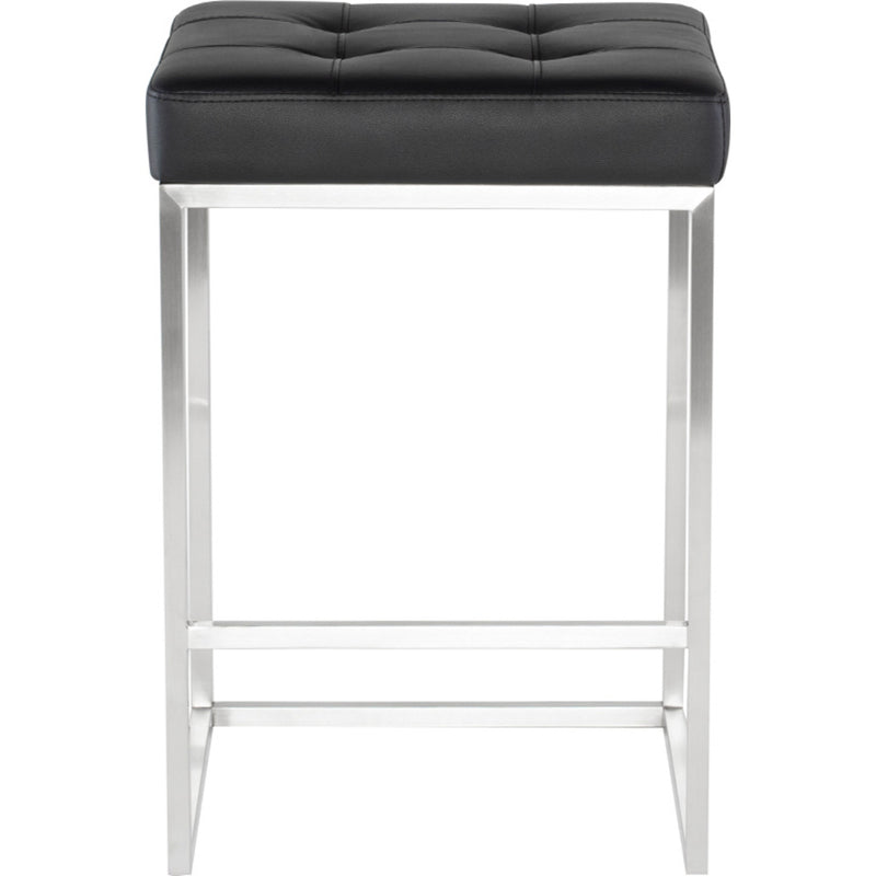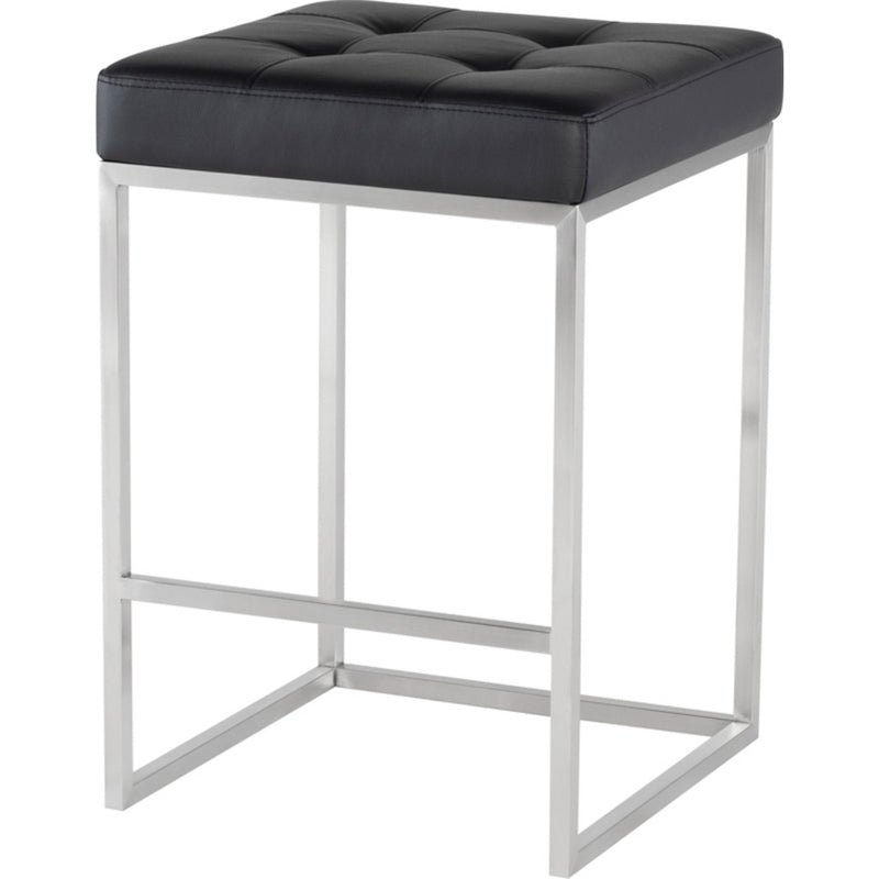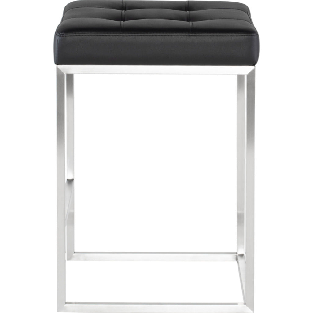 The Chi counter stool is an ideal example of simple elegant modern design. The brushed steel & gold stainless steel frame, including fixed foot rest, uses a bare minimum of materials in its construction creating an exceptionally light effect. The stool is topped with a dense form fitting tufted naugahyde seat cushion for added comfort.