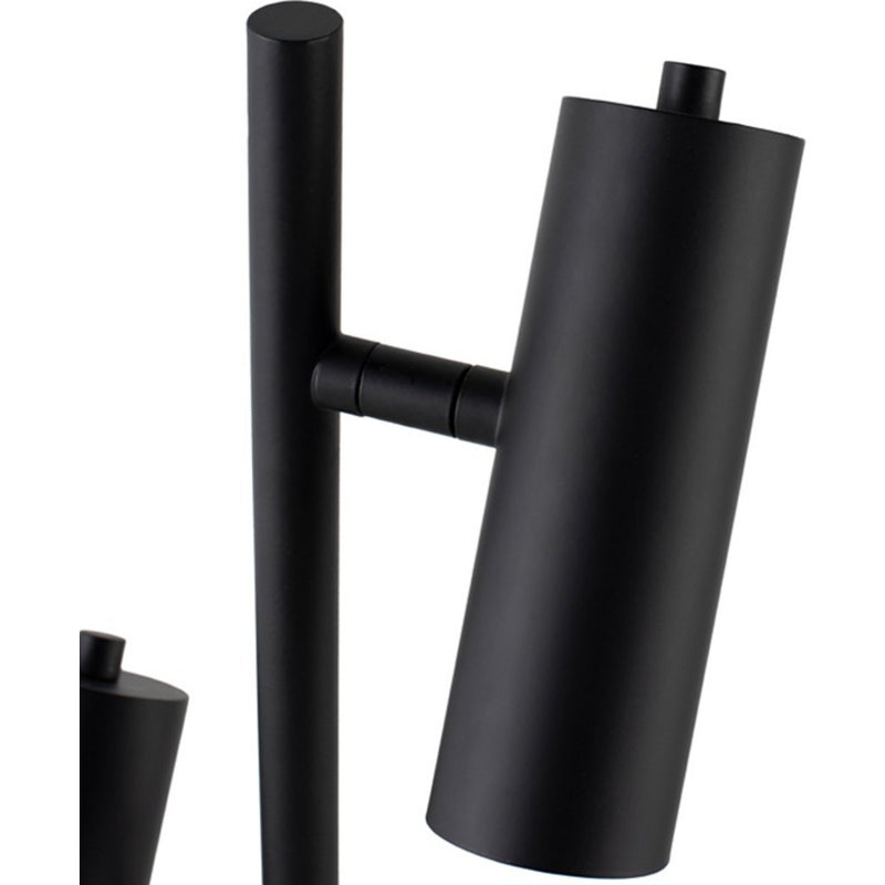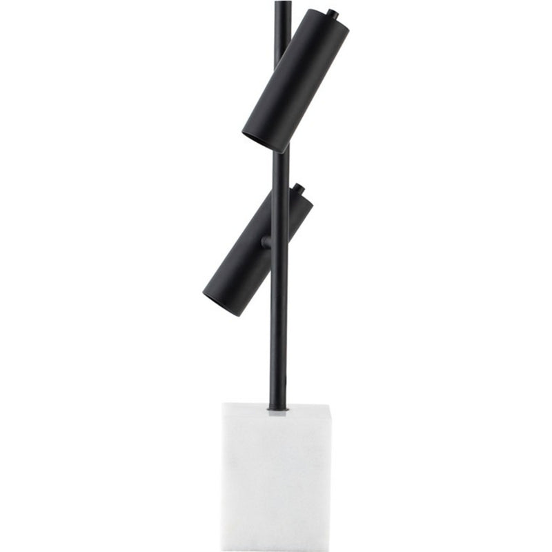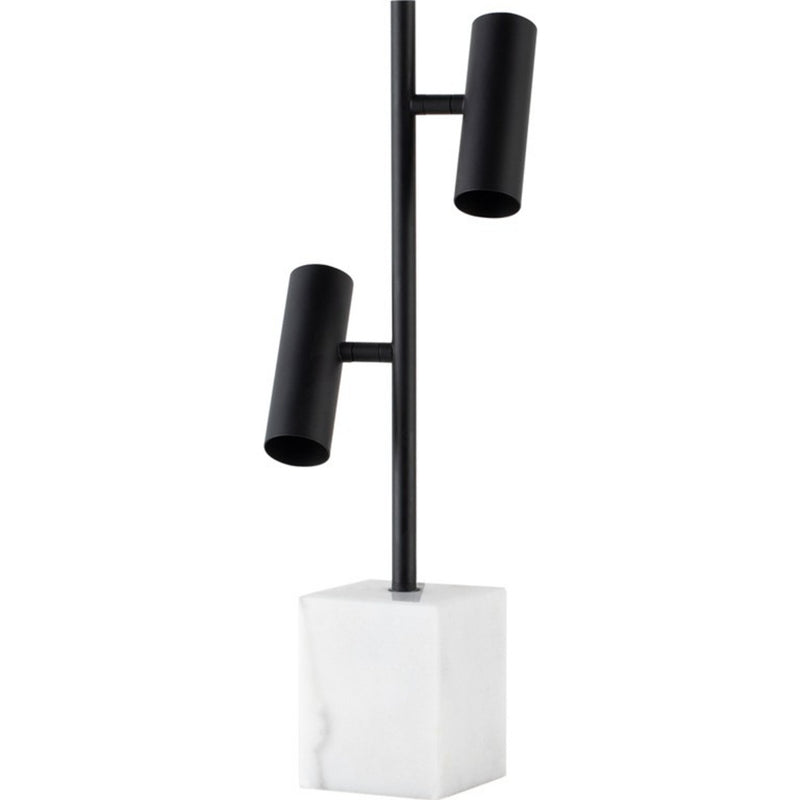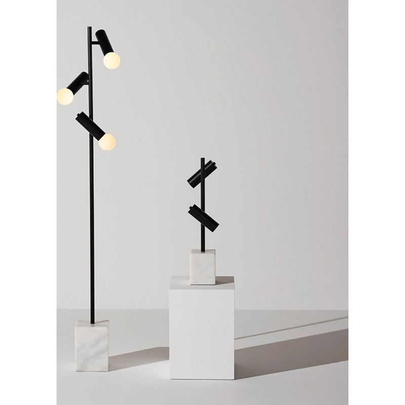 The impeccably modern Dane table light projects a cool composed charisma. A solid white marble base is paired with a matte black pipe frame supporting matte black adjustable cylinder shades, presenting slim tapered sophistication.