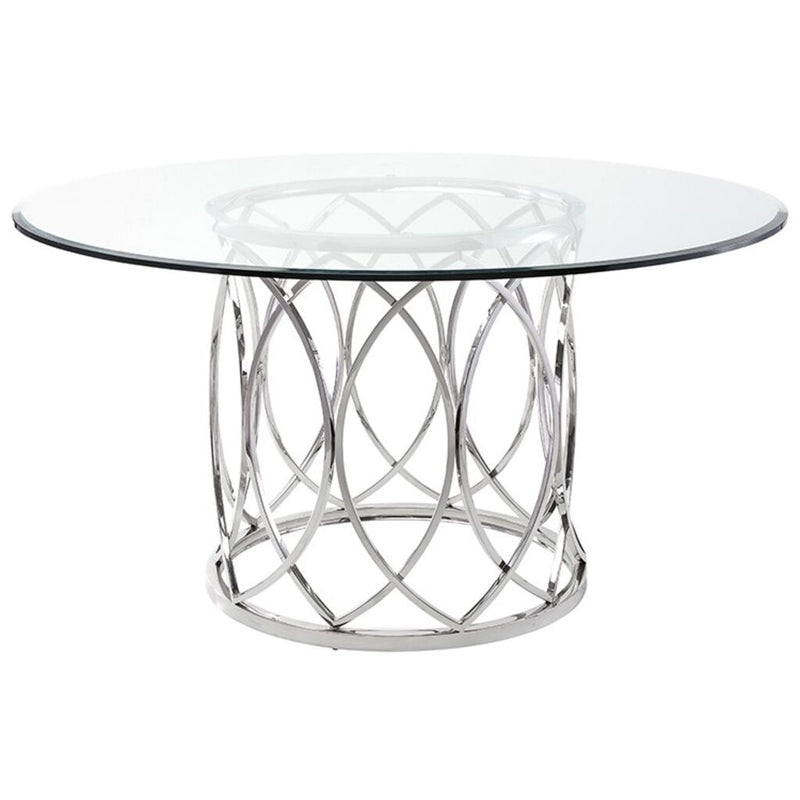 The Juliette dining table dazzles in high-polish stainless steel and glass. Characterized by interwoven rings in brilliant silver, the frame defines the Juliette inspiring glamour and occasion. The Juliette is available exclusively in polished stainless steel with ? inch beveled edge tempered glass in 59 inch.
