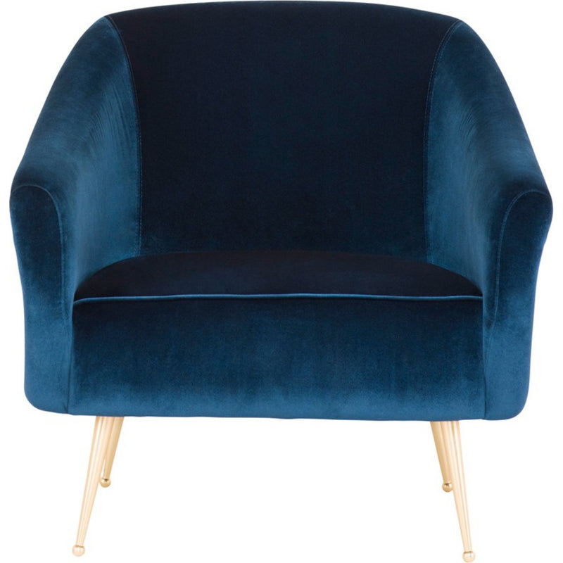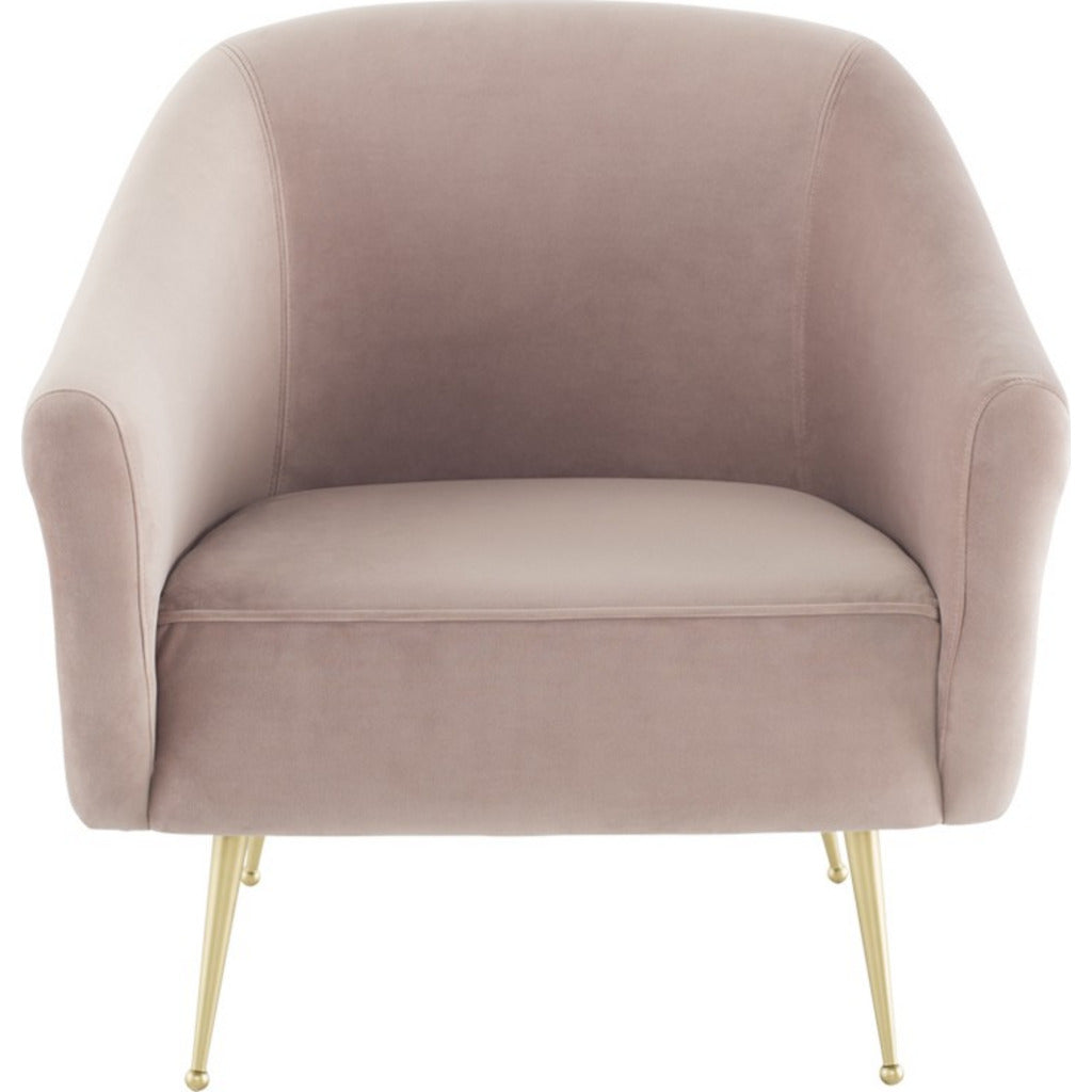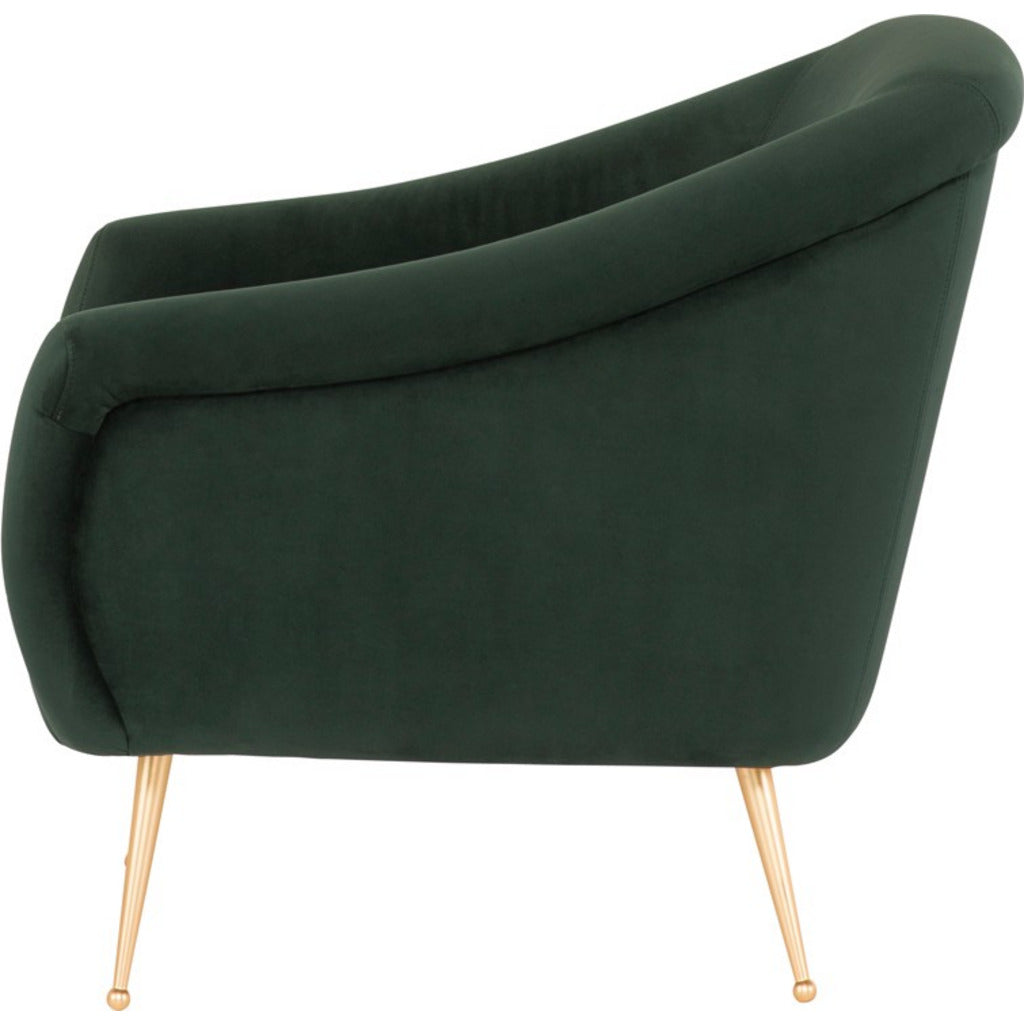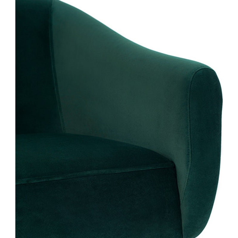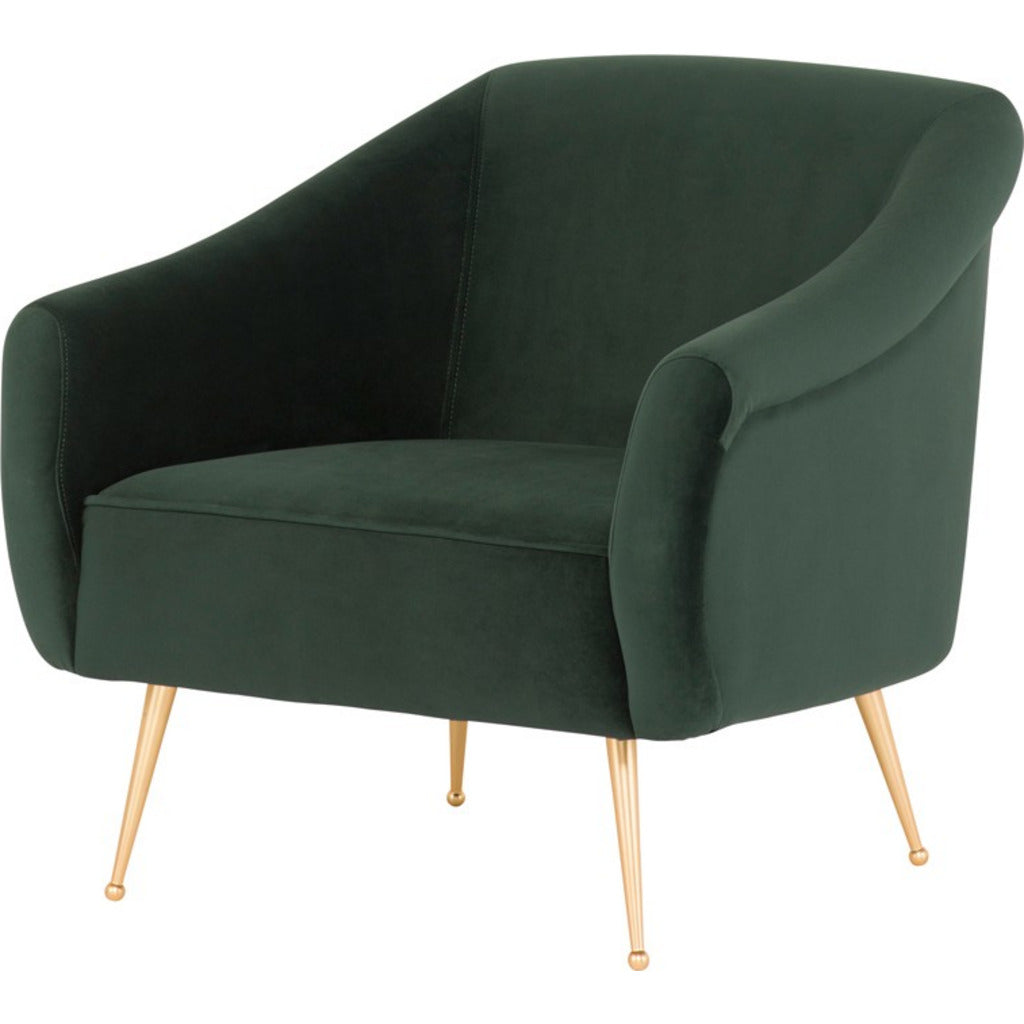 The Lucie occasional chair sets an uplifting tone highlighted by luminous velour fabric dense padding and soft rounded edges. The subtly sculpted form is supported by brushed gold stainless steel legs with an elegant spherical accent.